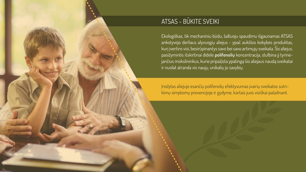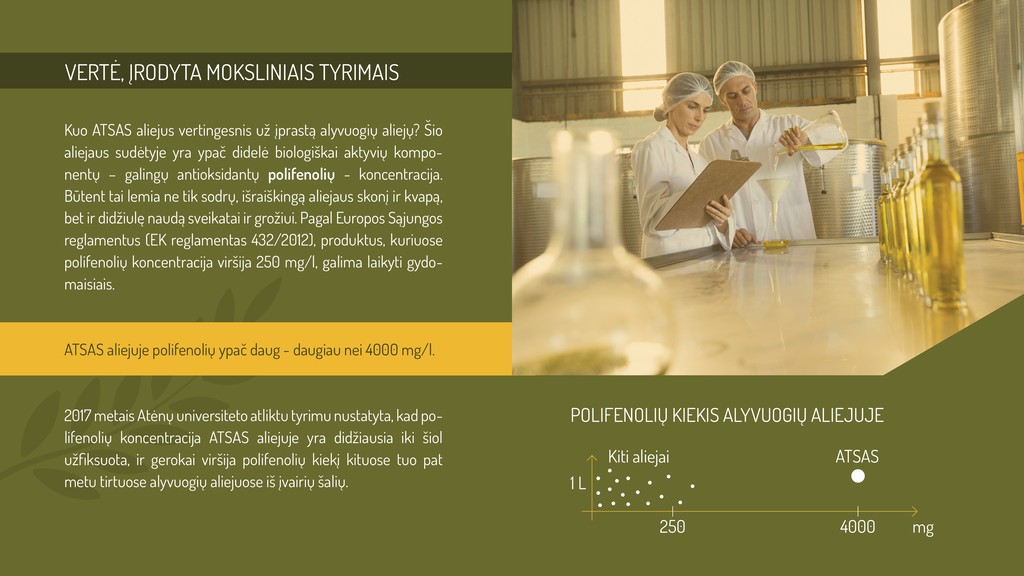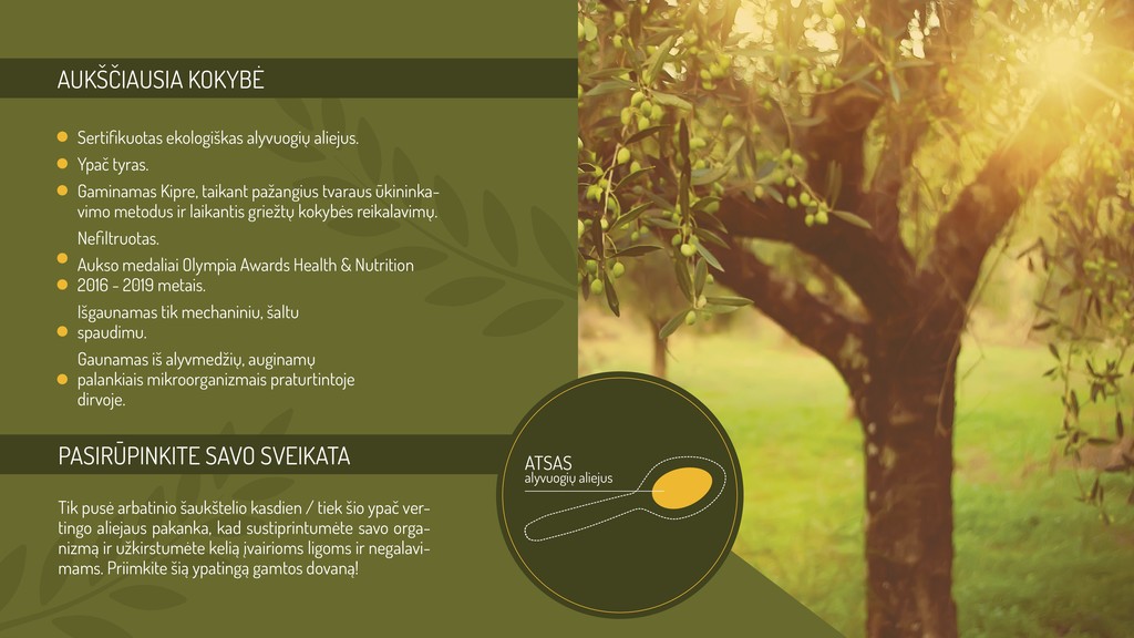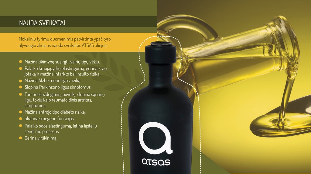 Tiekiame Lietuvos rinkai ypač tyrą, ekologišką, šalto spaudimo alyvuogių aliejų iš Kipro, kuris pasižymi išskirtinai didele antioksidantų - polifenolių koncentracija. Pagal Europos Sąjungos reglamentus (EK reglamentas 432/2012), polifenolių koncentracijai viršijant 250 mg/l, produktus galima laikyti gydomaisiais. ATSAS aliejuje polifenolių ypač daug - daugiau nei 4000 mg/l.