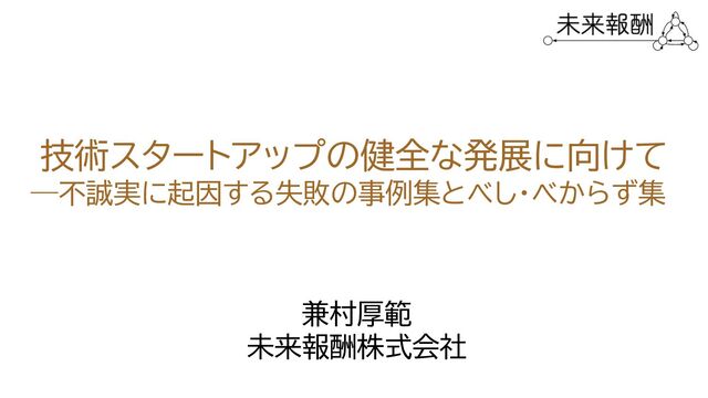 技術スタートアップの健全な発展に向けて —不誠実に起因す 失敗の事例集とべし・べか ず集 兼村厚範 未来報酬株式会社