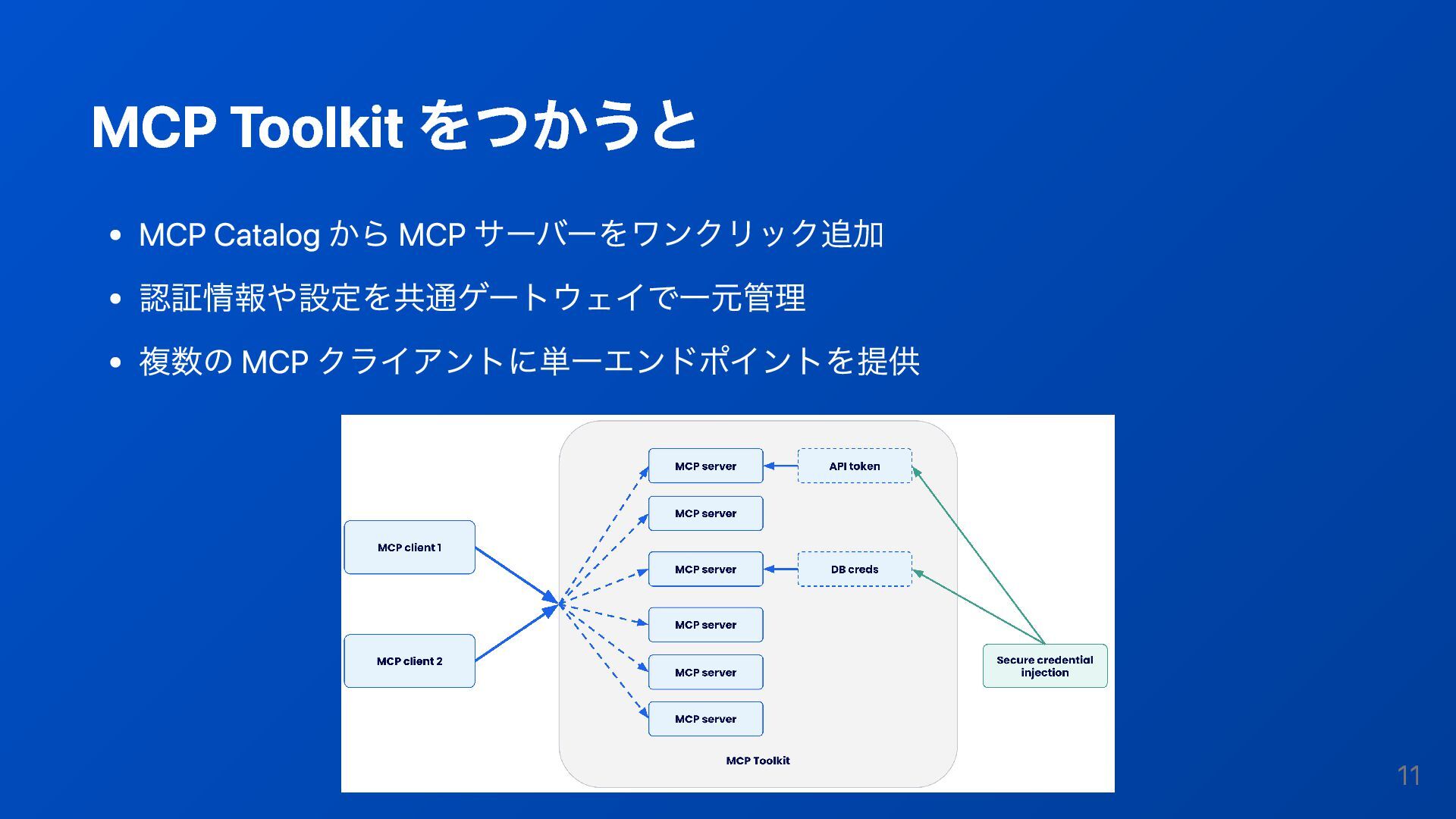 11 MCP Toolkit をつかうと MCP Catalog から MCP サーバーをワンクリック追加 認証情報や設定を共通ゲートウェイで一元管理