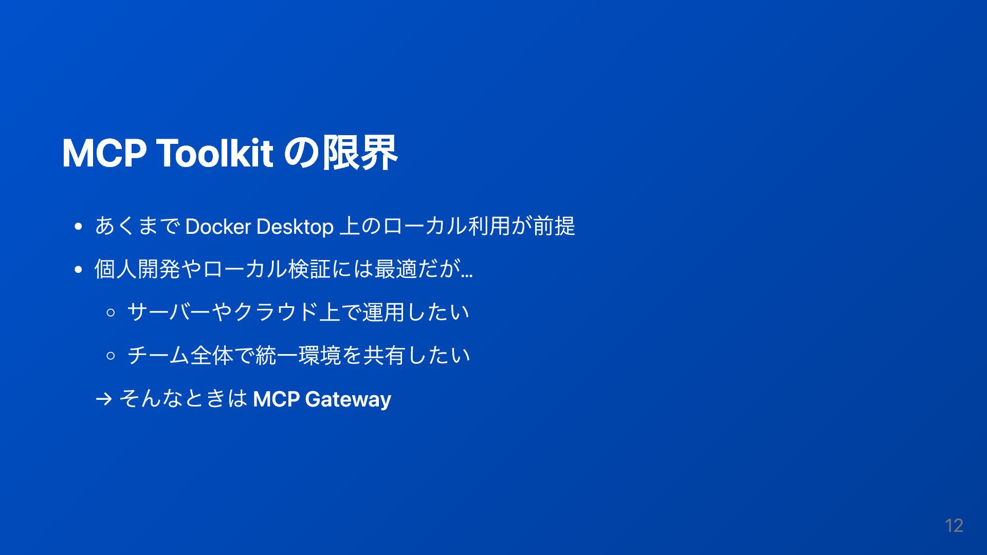 12 MCP Toolkit の限界 あくまで Docker Desktop 上のローカル利用が前提 個人開発やローカル検証には最適だが… サーバーやクラウド上で運用したい