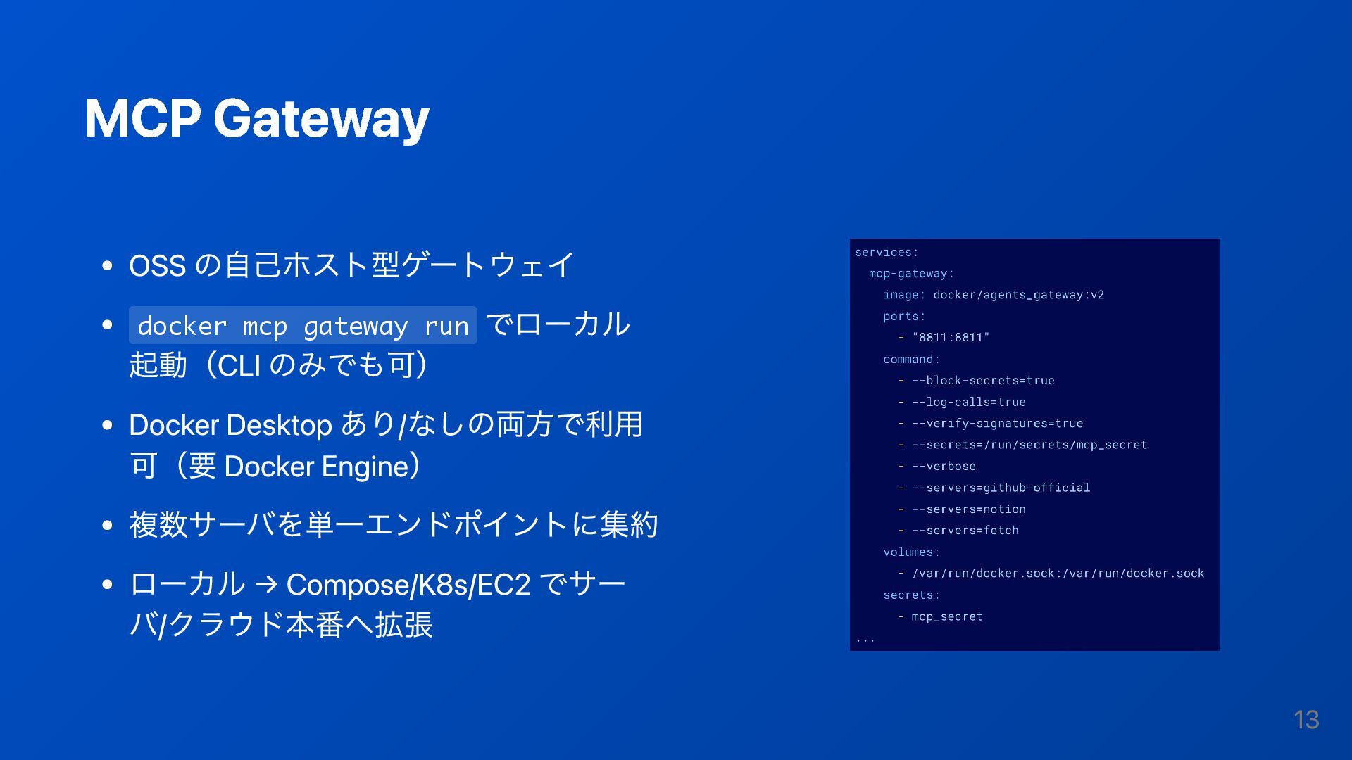 13 MCP Gateway OSS の自己ホスト型ゲートウェイ docker mcp gateway run でローカル