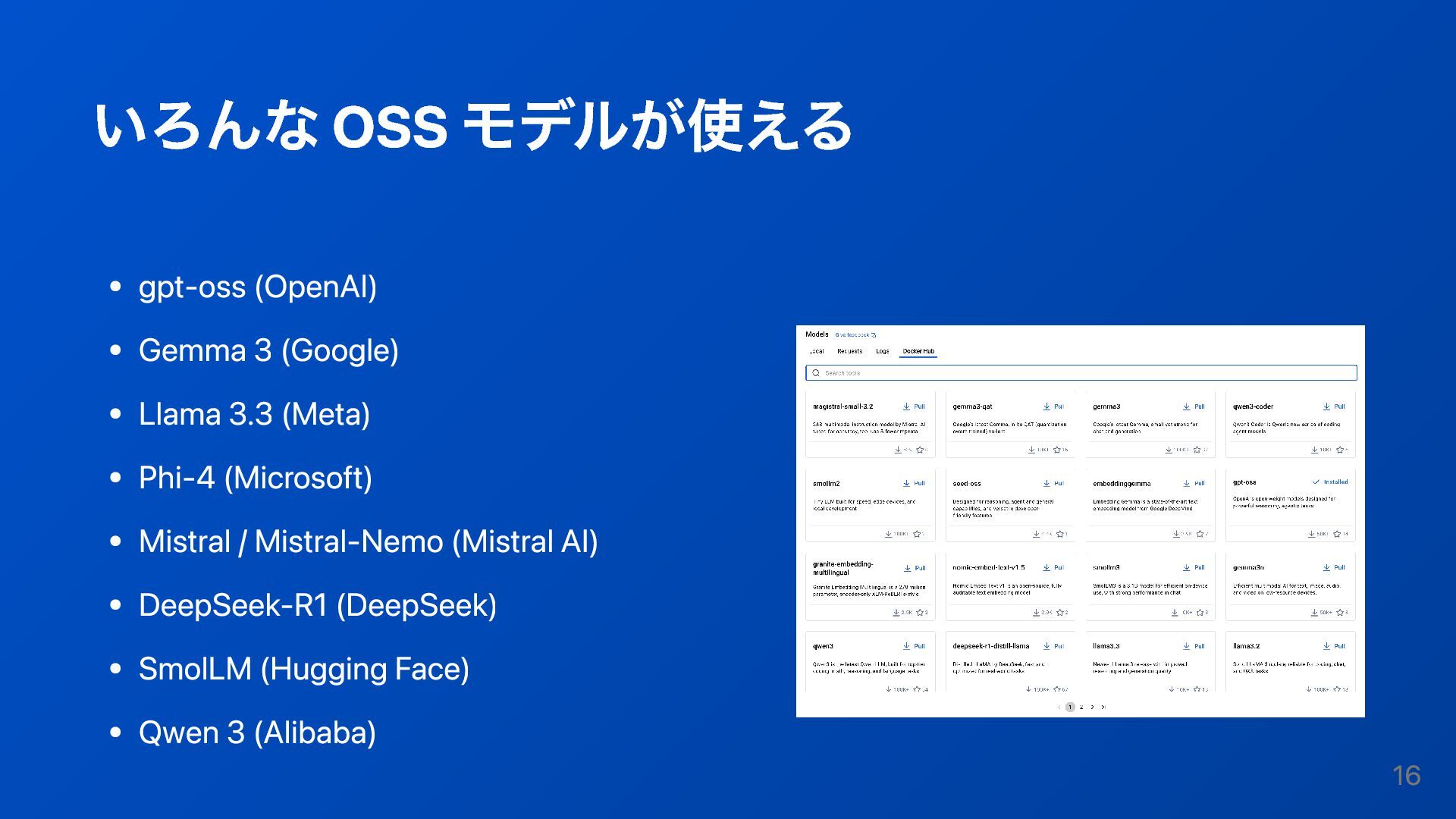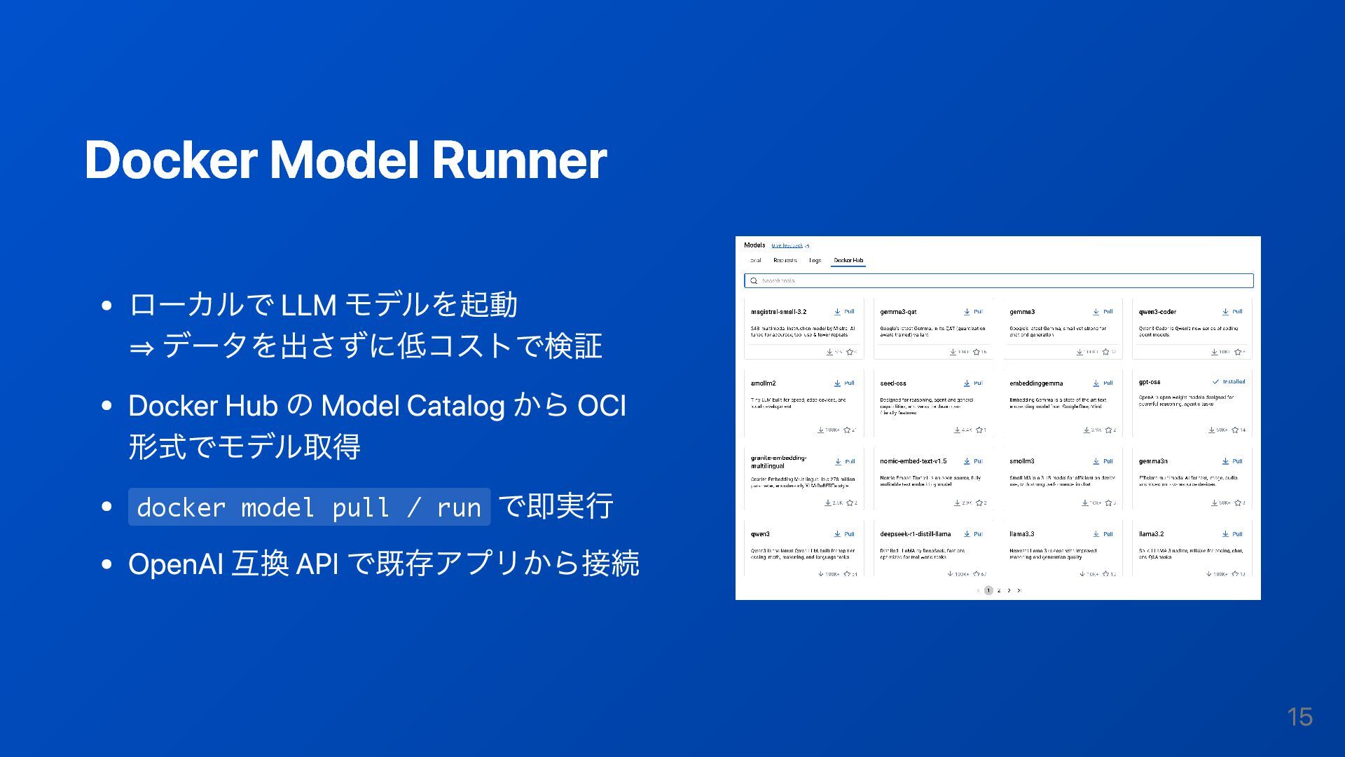 15 Docker Model Runner ローカルで LLM モデルを起動 ⇒ データを出さずに低コストで検証 Docker