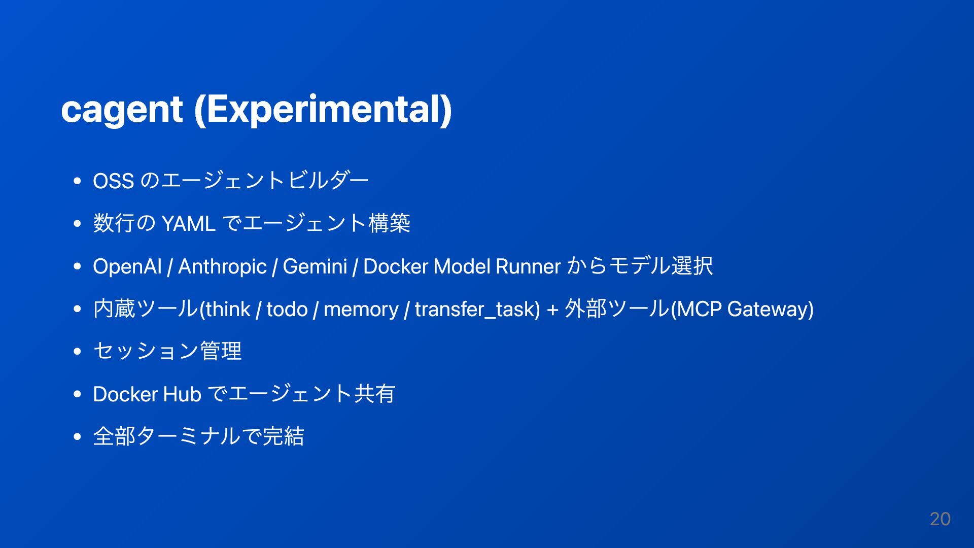 20 cagent (Experimental) OSS のエージェントビルダー 数行の YAML でエージェント構築 OpenAI /