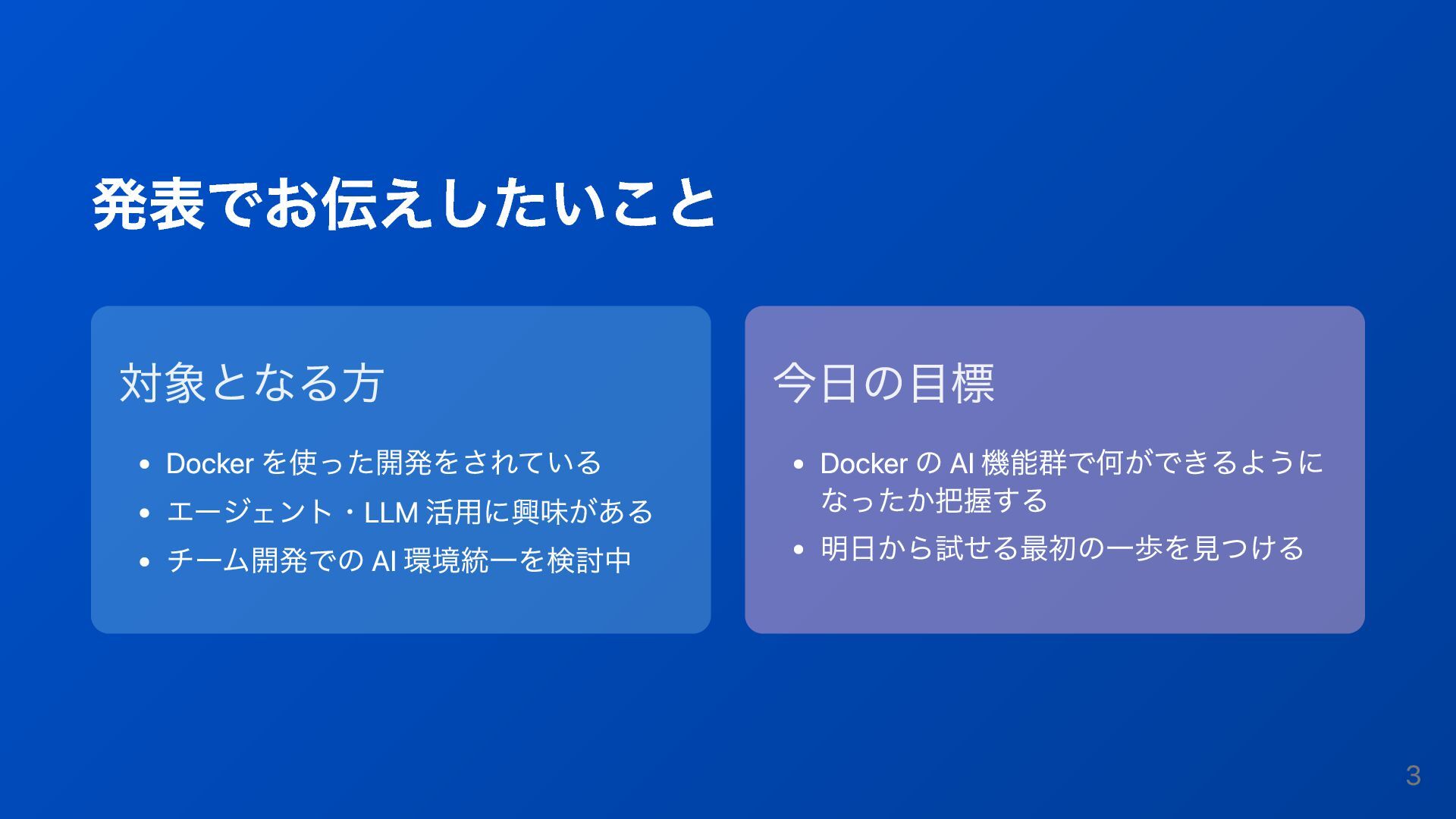 3 発表でお伝えしたいこと Docker を使った開発をされている エージェント・LLM 活用に興味がある チーム開発での AI 環境統一を検討中 対象となる方