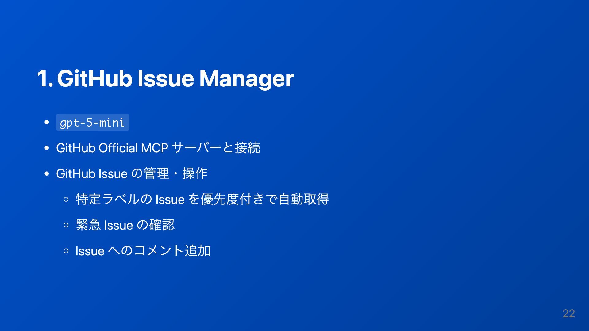22 1. GitHub Issue Manager gpt-5-mini GitHub Official MCP サーバーと接続