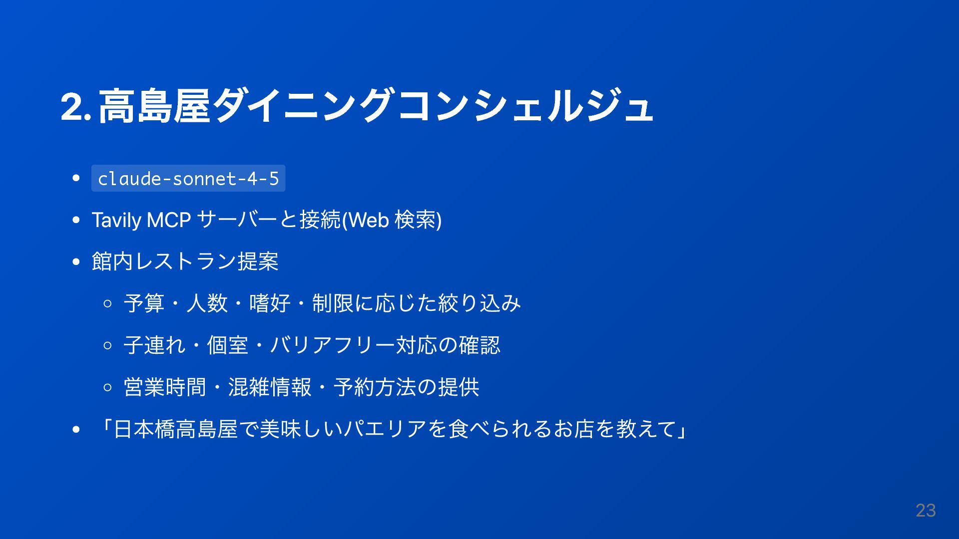 23 2. 高島屋ダイニングコンシェルジュ claude-sonnet-4-5 Tavily MCP サーバーと接続(Web 検索) 館内レストラン提案 予算・人数・嗜好・制限に応じた絞り込み