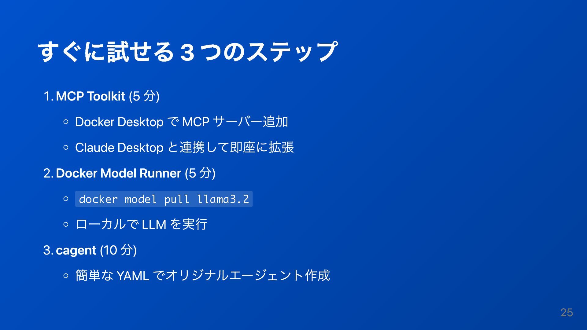 Desktop で MCP サーバー追加 Claude Desktop と連携して即座に拡張 2. Docker Model Runner (5 分) docker model pull llama3.2 ローカルで LLM を実行 3. cagent (10 分) 簡単な YAML でオリジナルエージェント作成