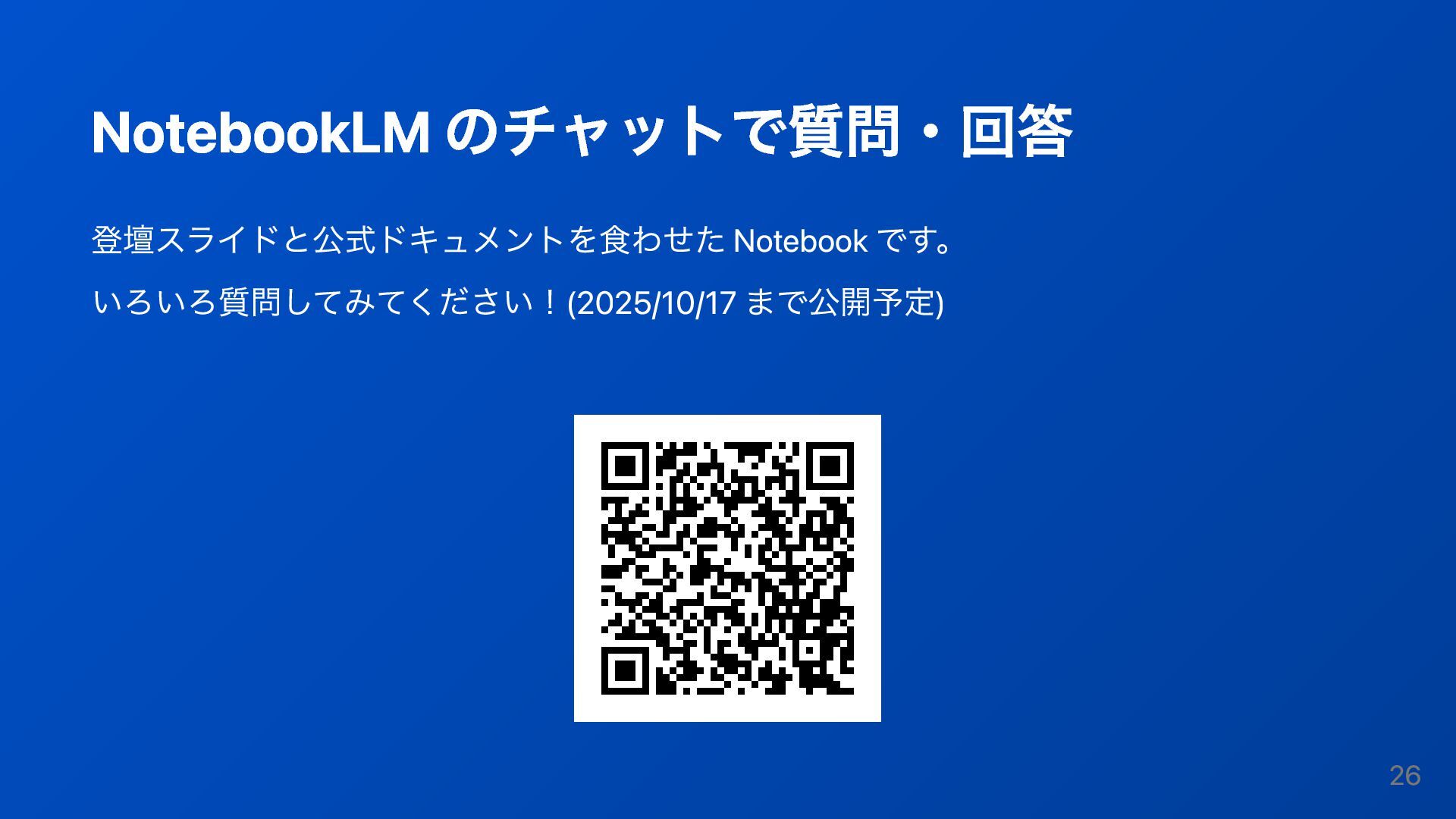 26 NotebookLM のチャットで質問・回答 登壇スライドと公式ドキュメントを食わせた Notebook です。 いろいろ質問してみてください!(2025/10/17 まで公開予定)