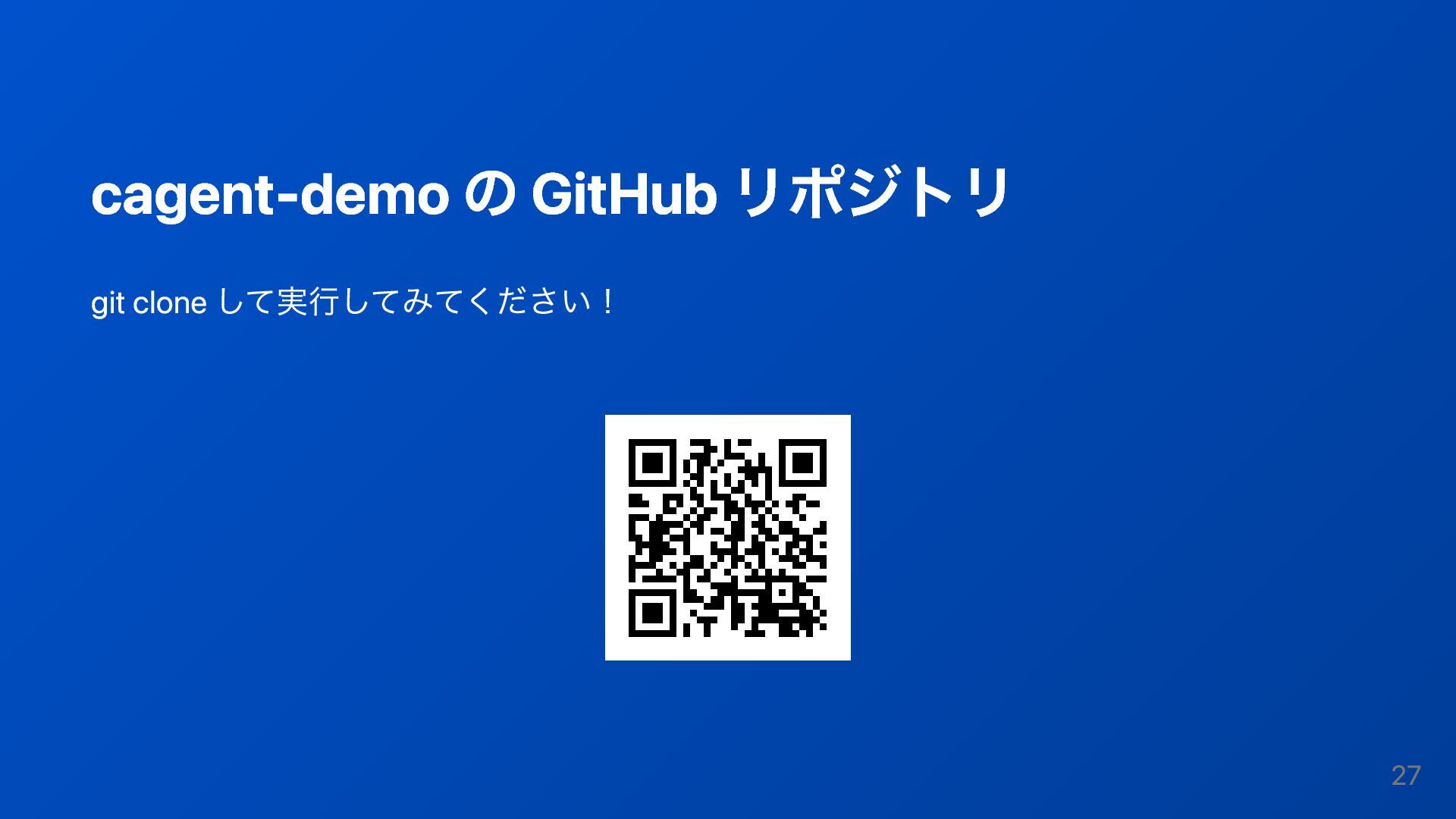 27 cagent-demo の GitHub リポジトリ git clone して実行してみてください!