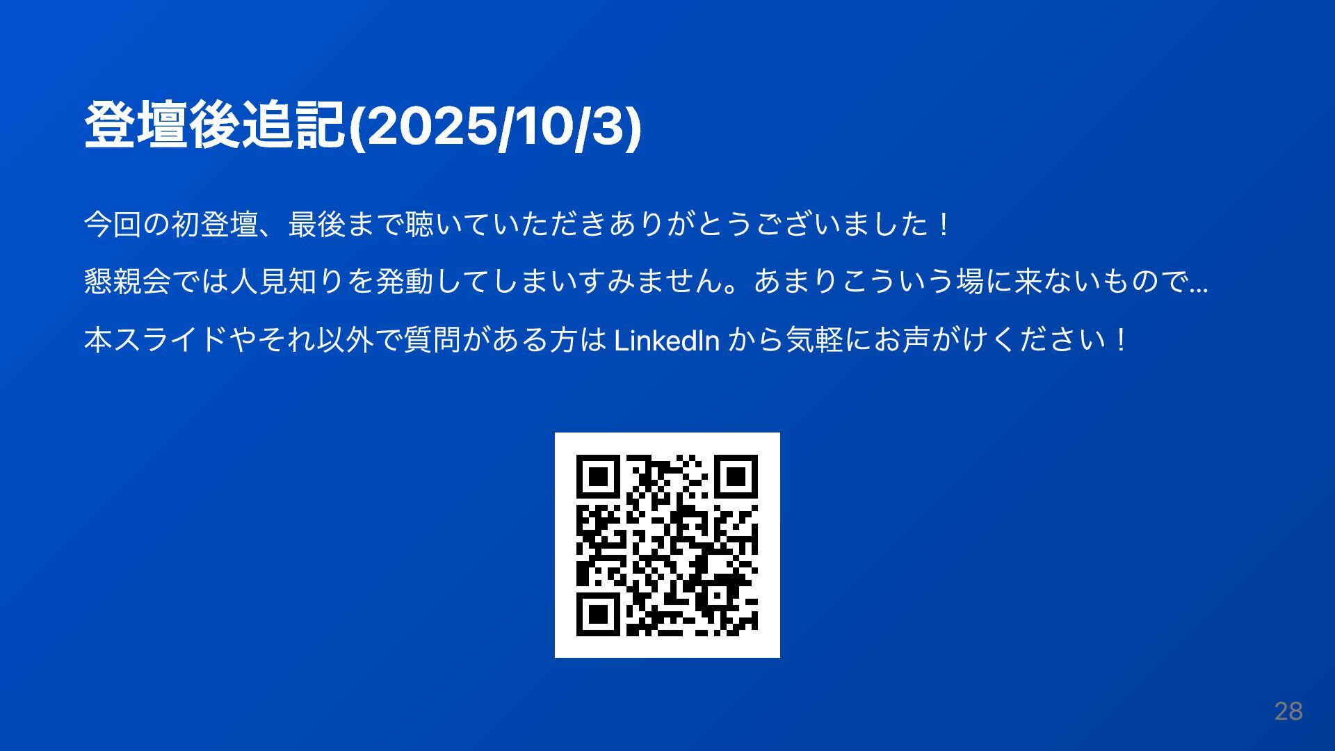 28 登壇後追記(2025/10/3) 今回の初登壇、最後まで聴いていただきありがとうございました! 懇親会では人見知りを発動してしまいすみません。あまりこういう場に来ないもので... 本スライドやそれ以外で質問がある方は LinkedIn から気軽にお声がけください!