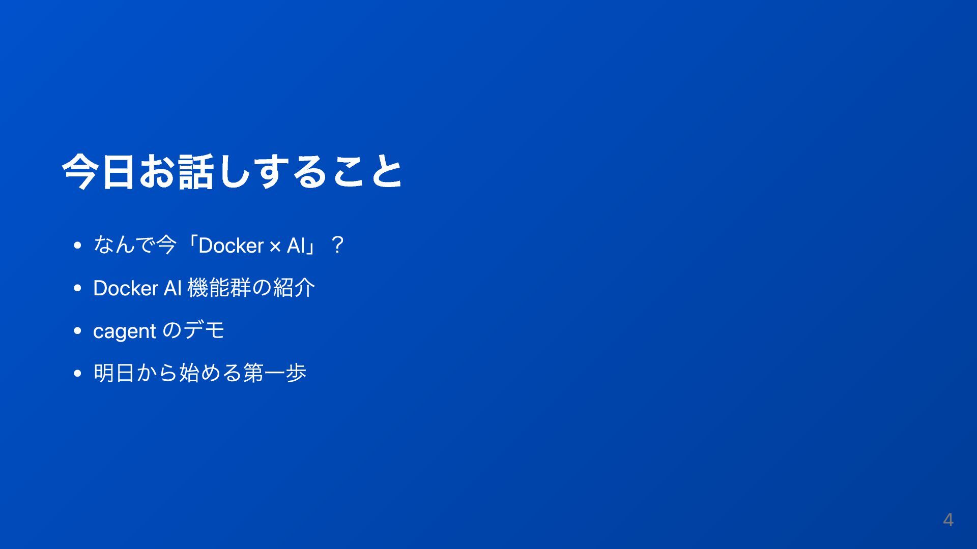 4 今日お話しすること なんで今「Docker × AI」? Docker AI 機能群の紹介 cagent のデモ