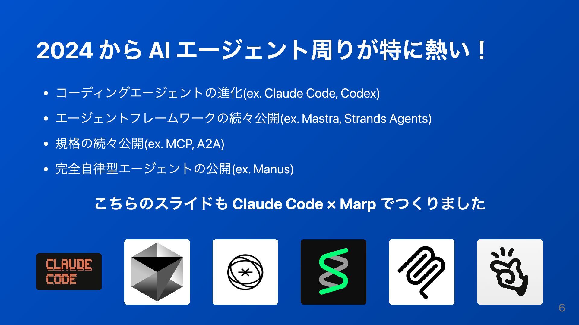 Mastra, Strands Agents) 規格の続々公開(ex. MCP, A2A) 完全自律型エージェントの公開(ex. Manus) こちらのスライドも Claude Code × Marp でつくりました