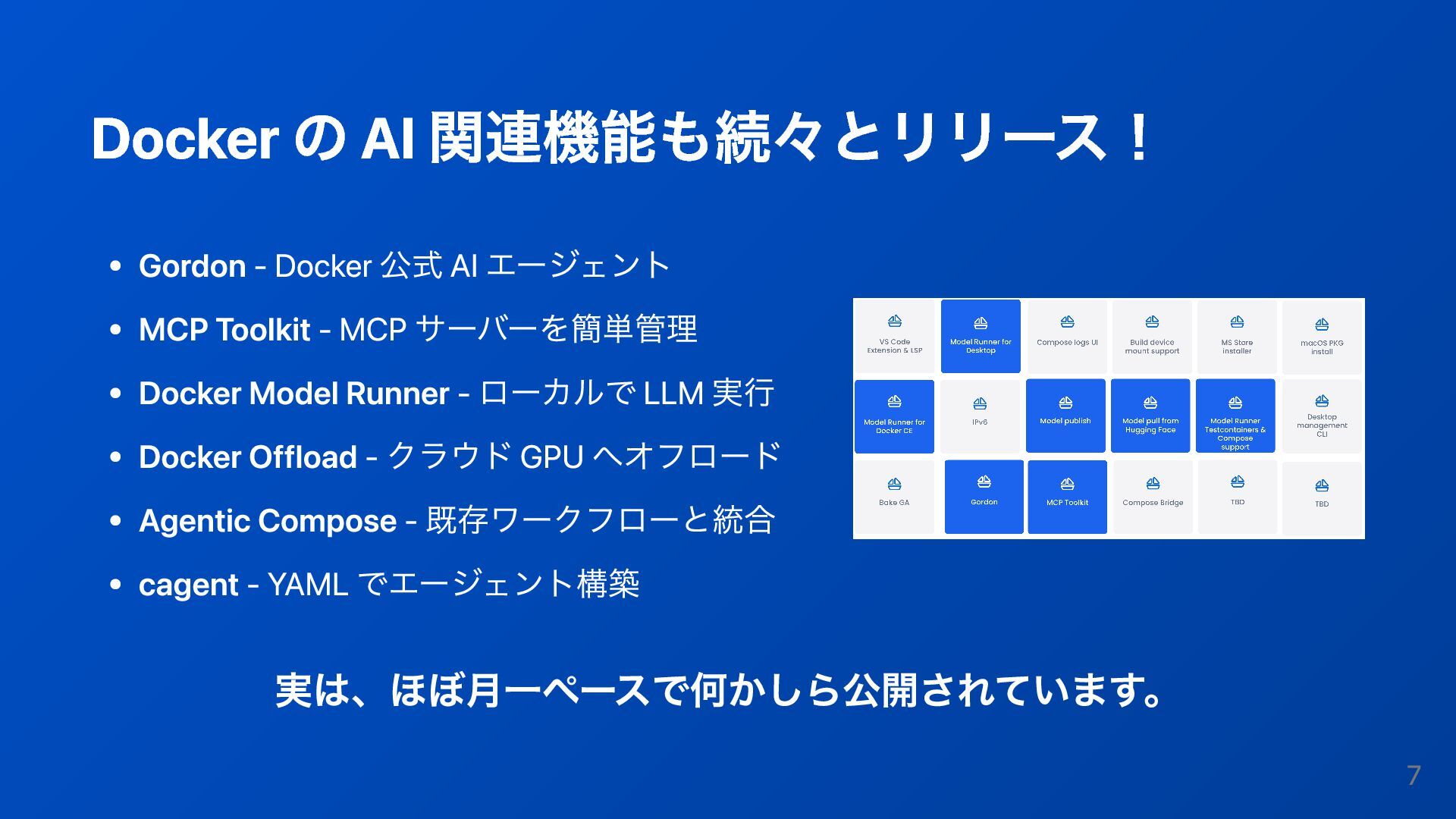 エージェント MCP Toolkit - MCP サーバーを簡単管理 Docker Model Runner - ローカルで LLM 実行 Docker Offload - クラウド GPU へオフロード Agentic Compose - 既存ワークフローと統合 cagent - YAML でエージェント構築 実は、ほぼ月一ペースで何かしら公開されています。