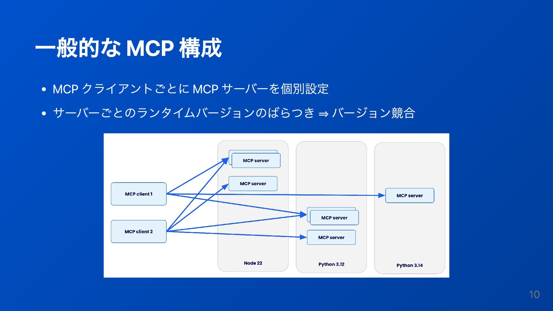 10 一般的な MCP 構成 MCP クライアントごとに MCP サーバーを個別設定 サーバーごとのランタイムバージョンのばらつき ⇒