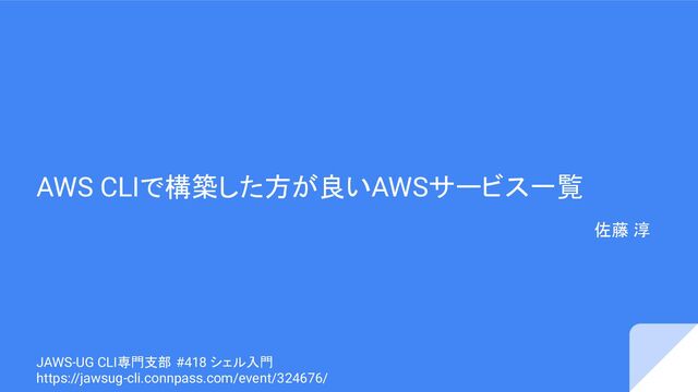 AWS CLIで構築した方が良いAWSサービス一覧 佐藤 淳 JAWS-UG CLI専門支部 #418 シェル入門 https://jawsug-cli.connpass.com/event/324676/