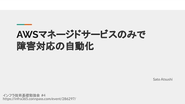 AWSマネージドサービスのみで 障害対応の自動化 インフラ技術基礎勉強会 #4 https://infra365.connpass.com/event/286297/ Sato Atsushi