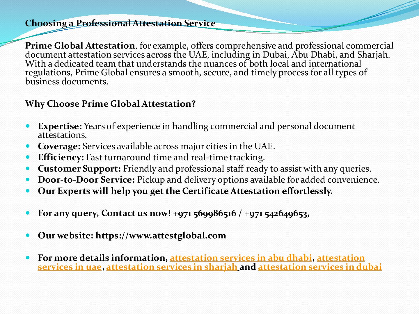 Prime Global Attestation Services is a leading provider of document attestation and authentication services in the UAE, specializing in ensuring compliance with local and international requirements. With expertise in attesting educational, personal, and commercial certificates from over 100 countries, they cater to needs such as visa processing, job applications, residency, and higher education. Known for their professionalism and efficiency, Prime Global streamlines the attestation process, offering end-to-end support, including MOFA, embassy, and legal document verifications. Their customer-focused approach ensures reliable, timely, and hassle-free services, making them a preferred choice in the UAE.