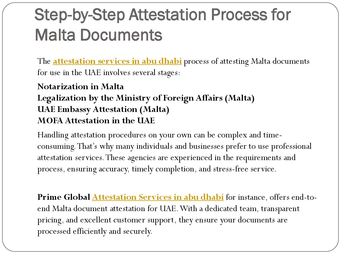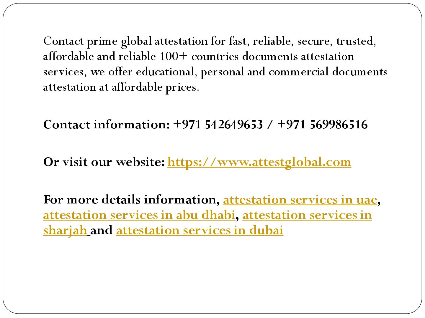 Prime Global Attestation Services in the UAE offers reliable and efficient document attestation services for over 100+ countries. With a focus on accuracy and quick turnaround times, we ensure your documents are legally recognized and accepted by UAE authorities, making the process seamless and hassle-free.