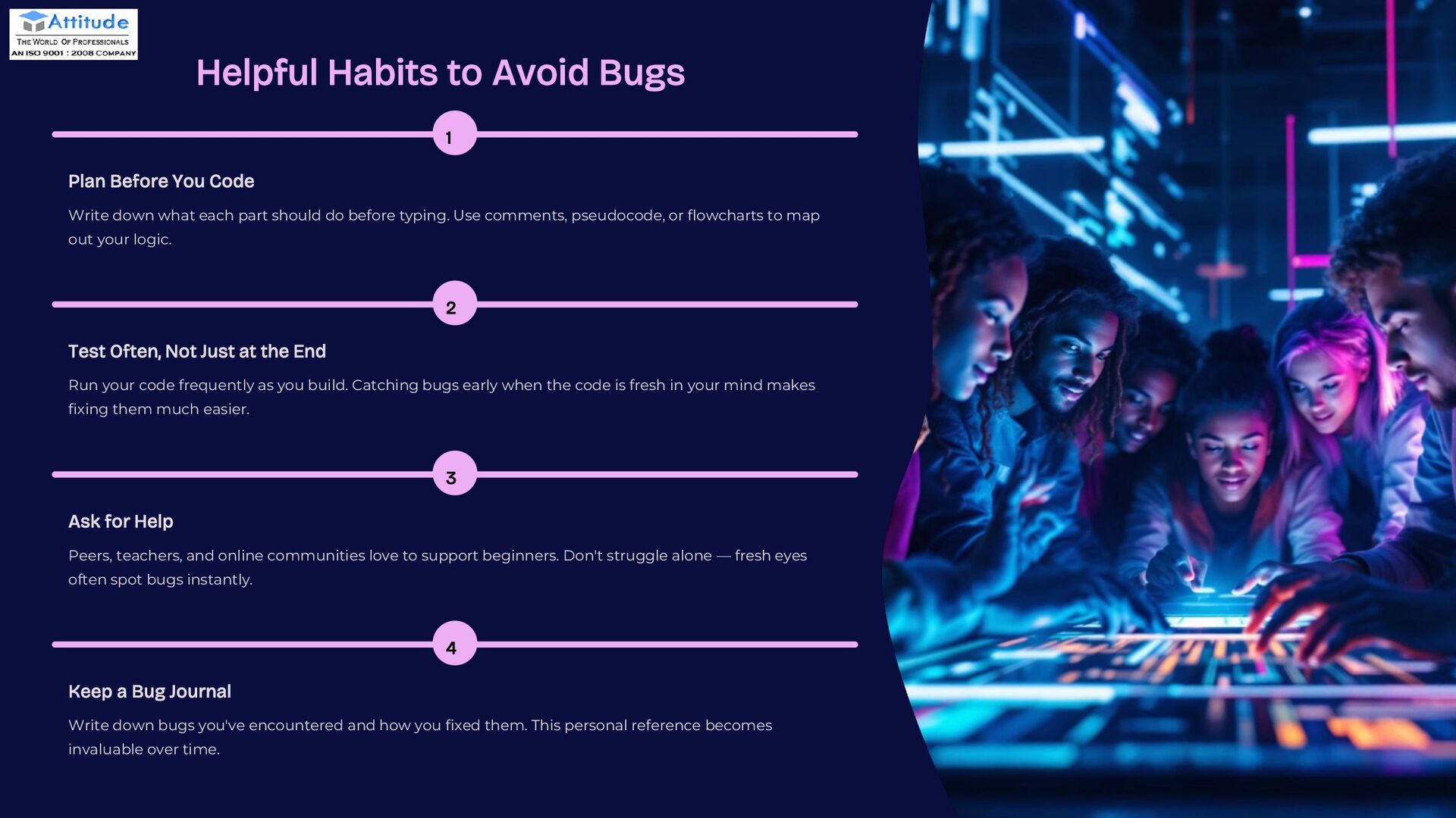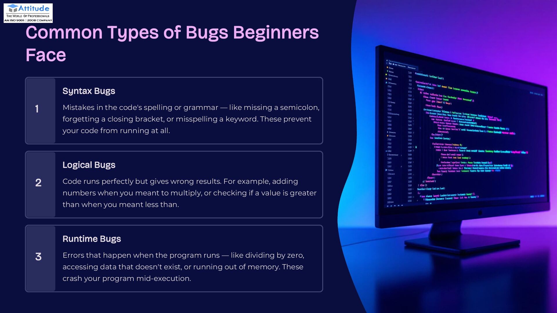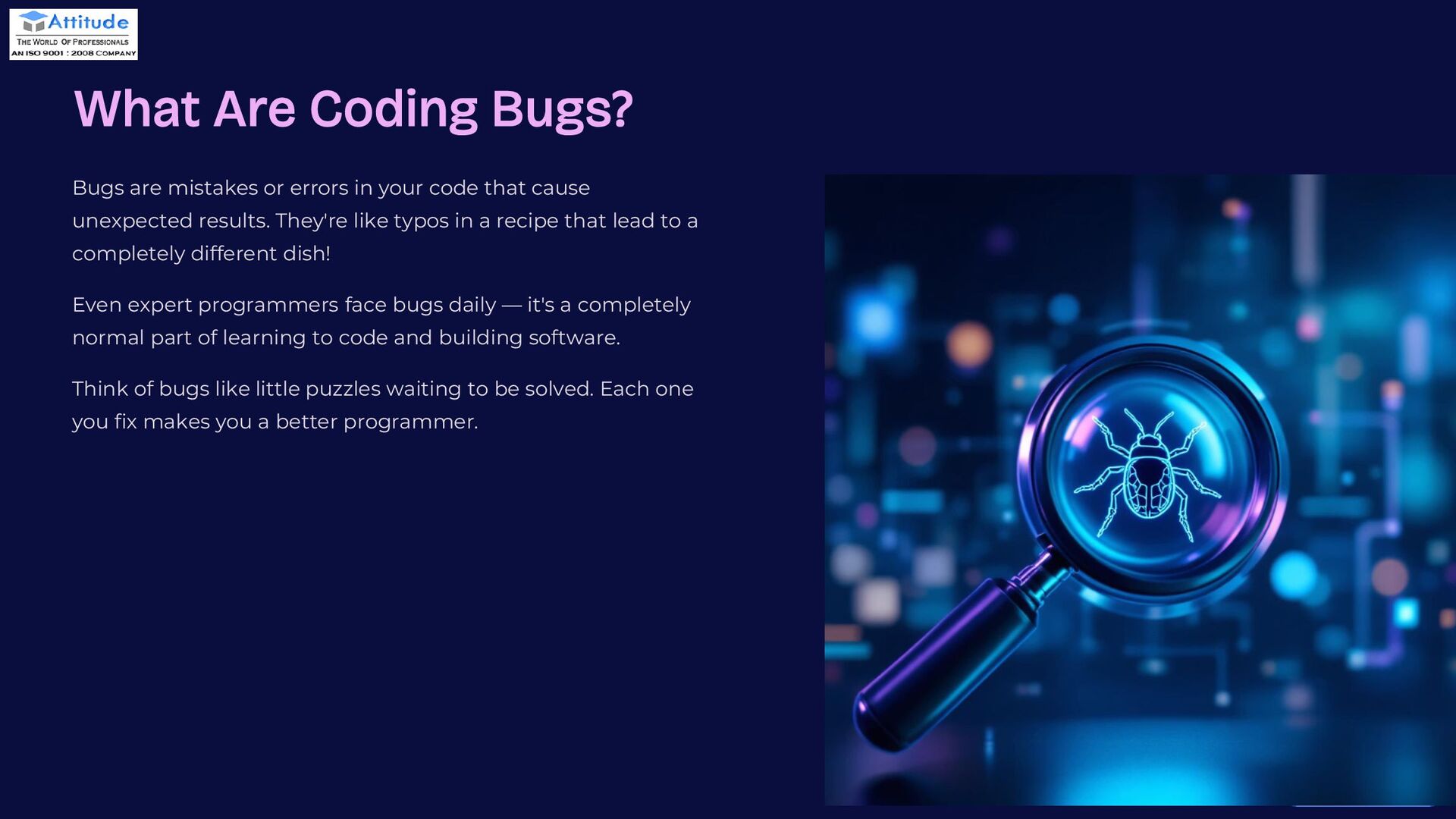 Every programmer, especially beginners, faces coding bugs — they’re a natural part of learning to code! The trick is knowing how to handle them smartly. Start by reading error messages carefully, as they often point directly to the problem. Use debugging tools and test your code in small sections to find where things go wrong.