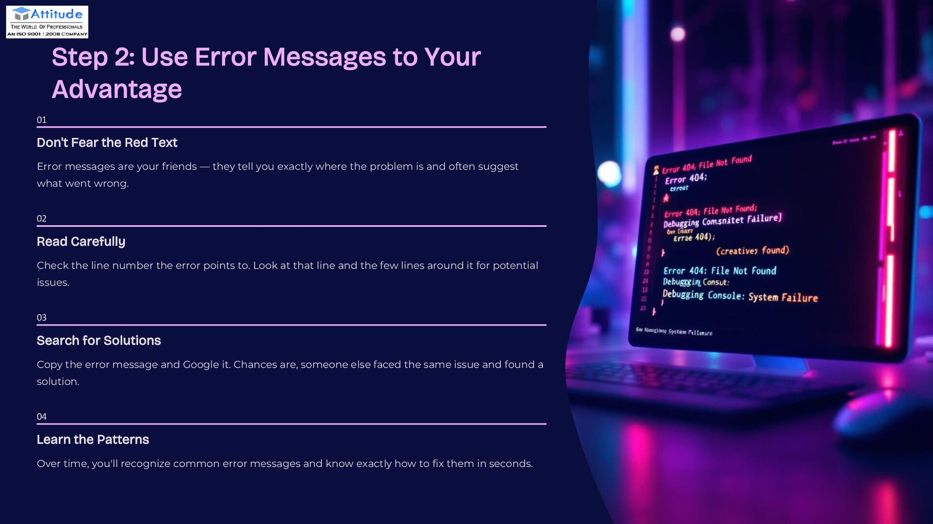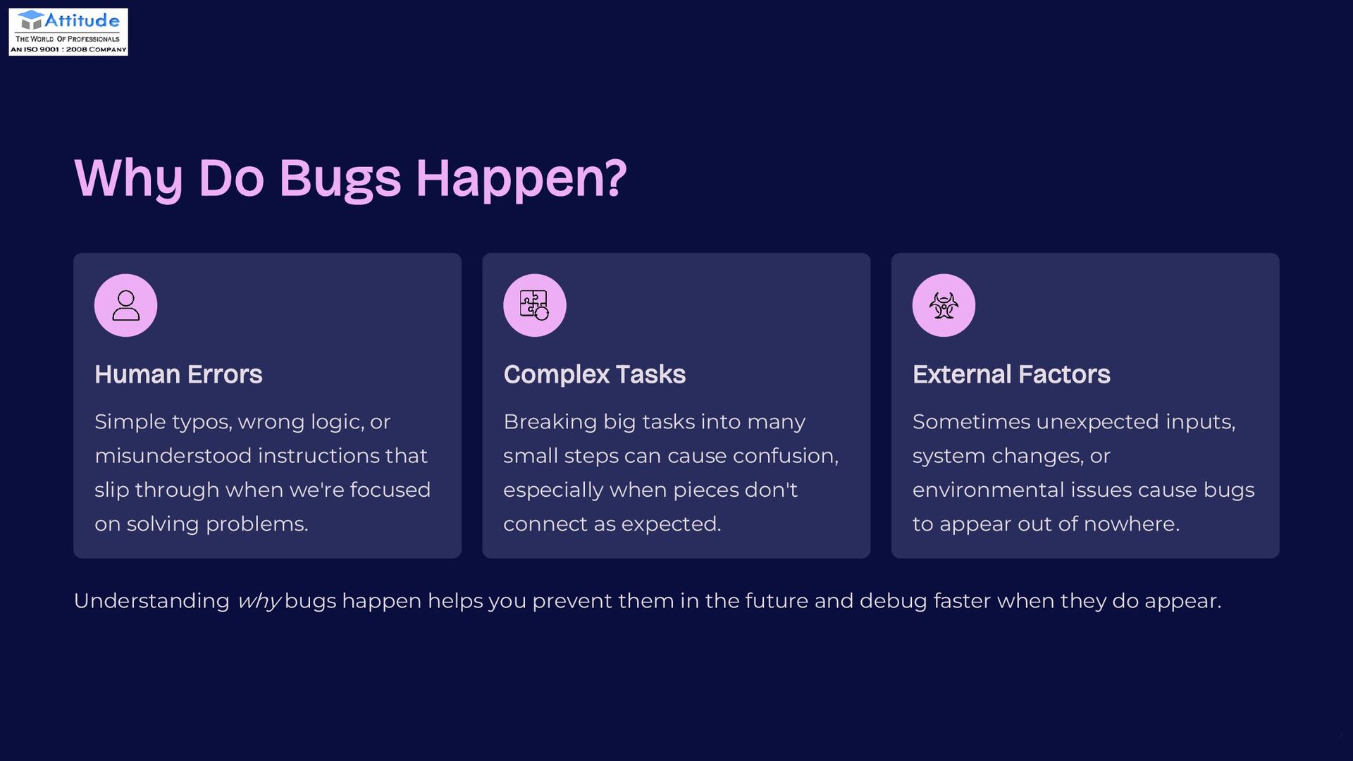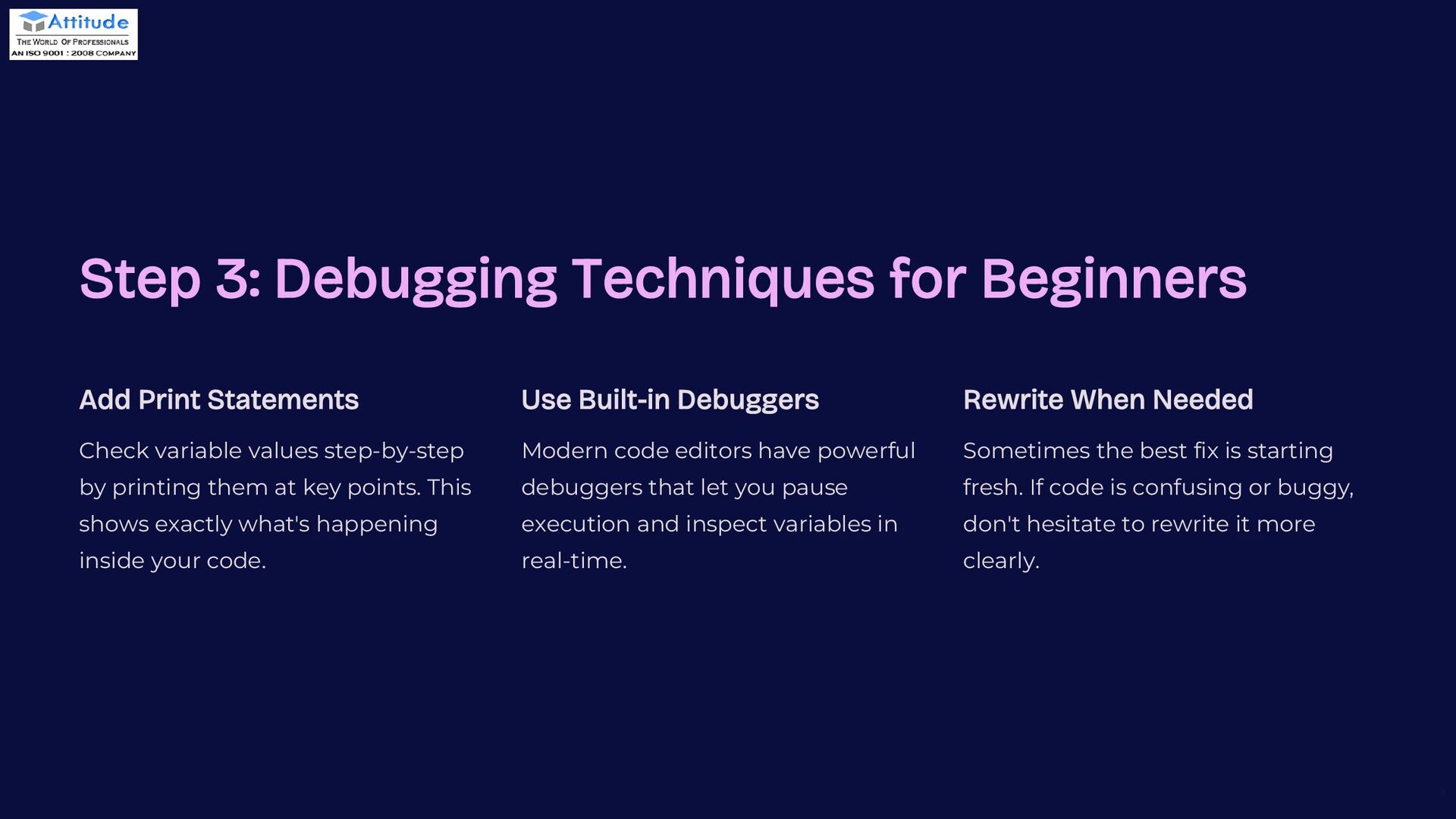Every programmer, especially beginners, faces coding bugs — they’re a natural part of learning to code! The trick is knowing how to handle them smartly. Start by reading error messages carefully, as they often point directly to the problem. Use debugging tools and test your code in small sections to find where things go wrong.
