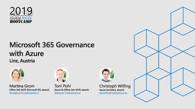 Presentation at Global Azure Bootcamp 2019, in Linz, Austria by Martina Grom, Toni Pohl and Christoph Wilfing, all with www.atwork.at.
