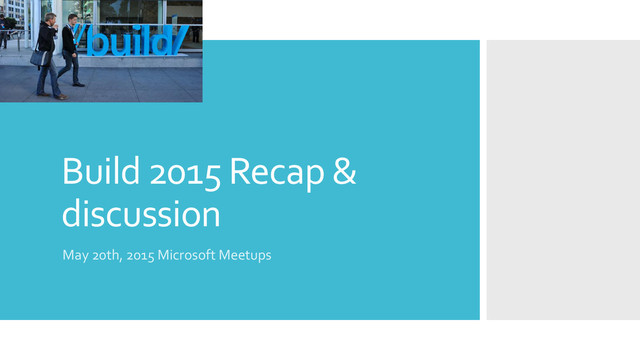 than 160 sessions 3.43 million viewers in 197 countries The live stream had 330,000 Day 1 viewers, with 631,344 unique live viewers across all days, the largest Build (or Channel 9) event to date 1.5 million views of the Square Enix DirectX 12 Demo on YouTube 32.6 million people have used the how-old.net website to analyze 236 million images 1.9 million clicks to the face API in the AML gallery Hungry, hungry developers 3,465 gallons of coffee consumed >18k breakfast pastries 12.6 terabytes of data downloaded 22,578 sodas 22,162 pieces of fruit