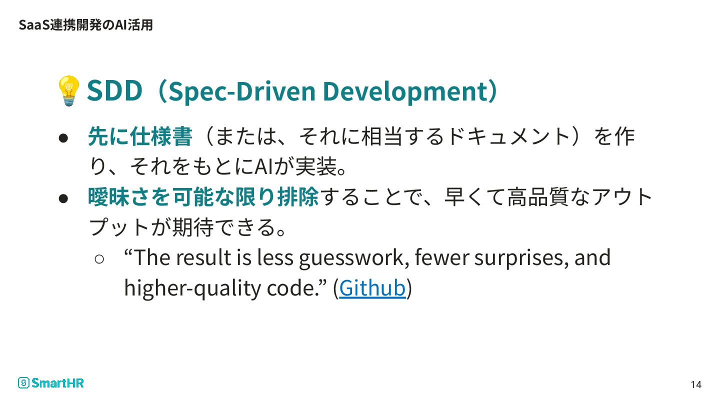 💡SDD(Spec-Driven Development) • 先に仕様書(または、それに相当するドキュメント)を作 り、それをもとにAIが実装。 • 曖昧さを可能な限り排除することで、早くて⾼品質なアウト プットが期待できる。 ◦ “The