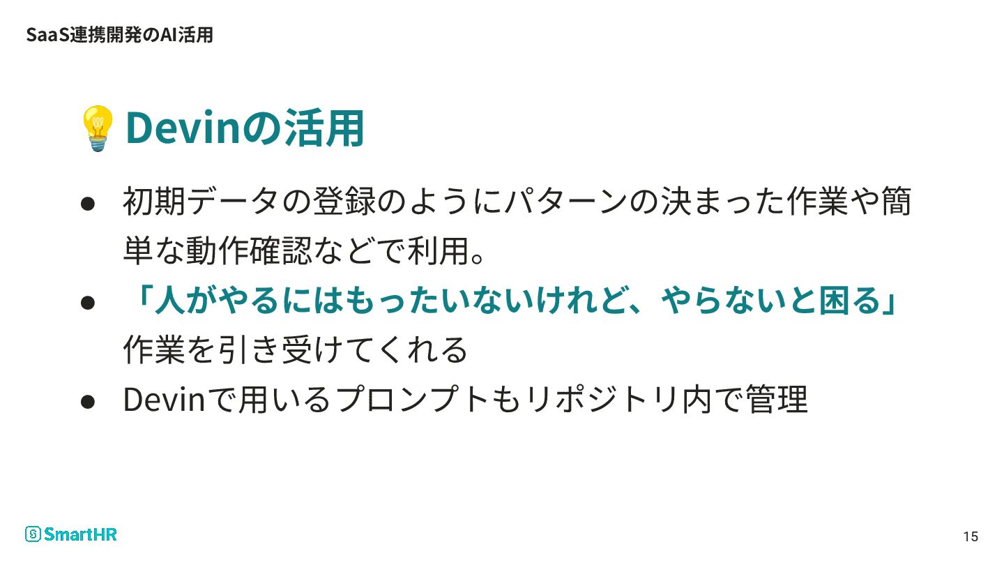 💡Devinの活⽤ • 初期データの登録のようにパターンの決まった作業や簡 単な動作確認などで利⽤。 • 「⼈がやるにはもったいないけれど、やらないと困る」 作業を引き受けてくれる • Devinで⽤いるプロンプトもリポジトリ内で管理 SaaS連携開発のAI活⽤