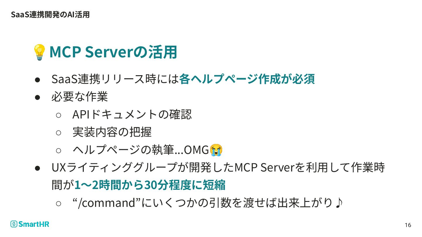 ◦ ヘルプページの執筆...OMG😭 • UXライティンググループが開発したMCP Serverを利⽤して作業時 間が1〜2時間から30分程度に短縮 ◦ “/command”にいくつかの引数を渡せば出来上がり♪ SaaS連携開発のAI活⽤ 16