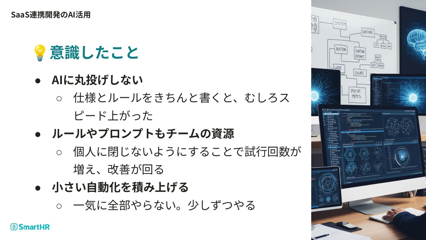 💡意識したこと • AIに丸投げしない ◦ 仕様とルールをきちんと書くと、むしろス ピード上がった • ルールやプロンプトもチームの資源 ◦ 個⼈に閉じないようにすることで試⾏回数が