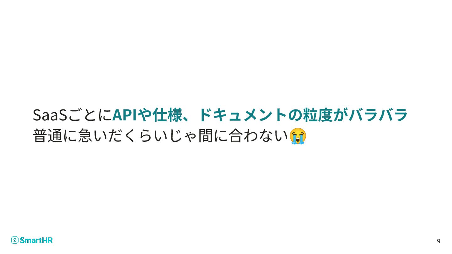 SaaSごとにAPIや仕様、ドキュメントの粒度がバラバラ 普通に急いだくらいじゃ間に合わない😭 9
