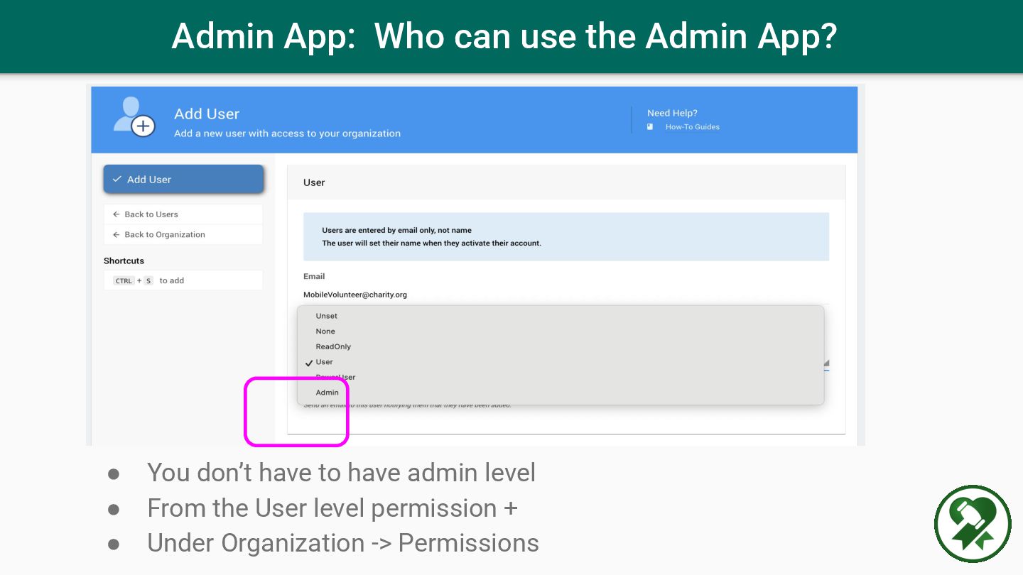 don’t have to have admin level • From the User level permission + • Under Organization -> Permissions