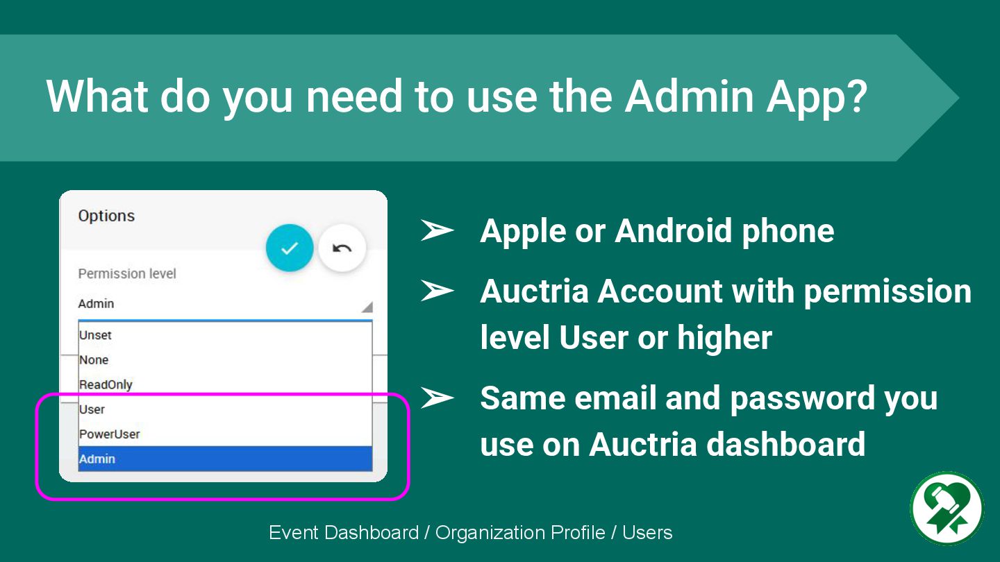 level User or higher ➢ Same email and password you use on Auctria dashboard What do you need to use the Admin App? Event Dashboard / Organization Profile / Users