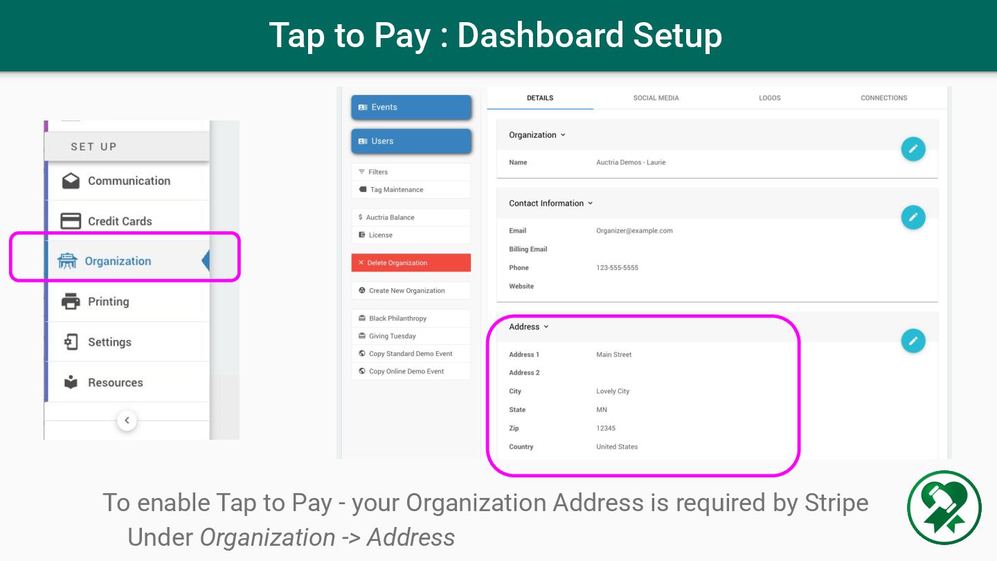 Pay - your Organization Address is required by Stripe Under Organization -> Address