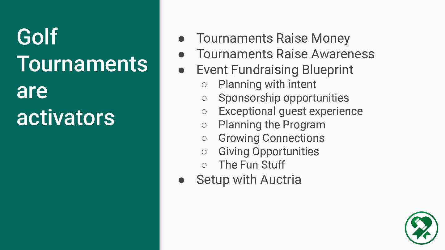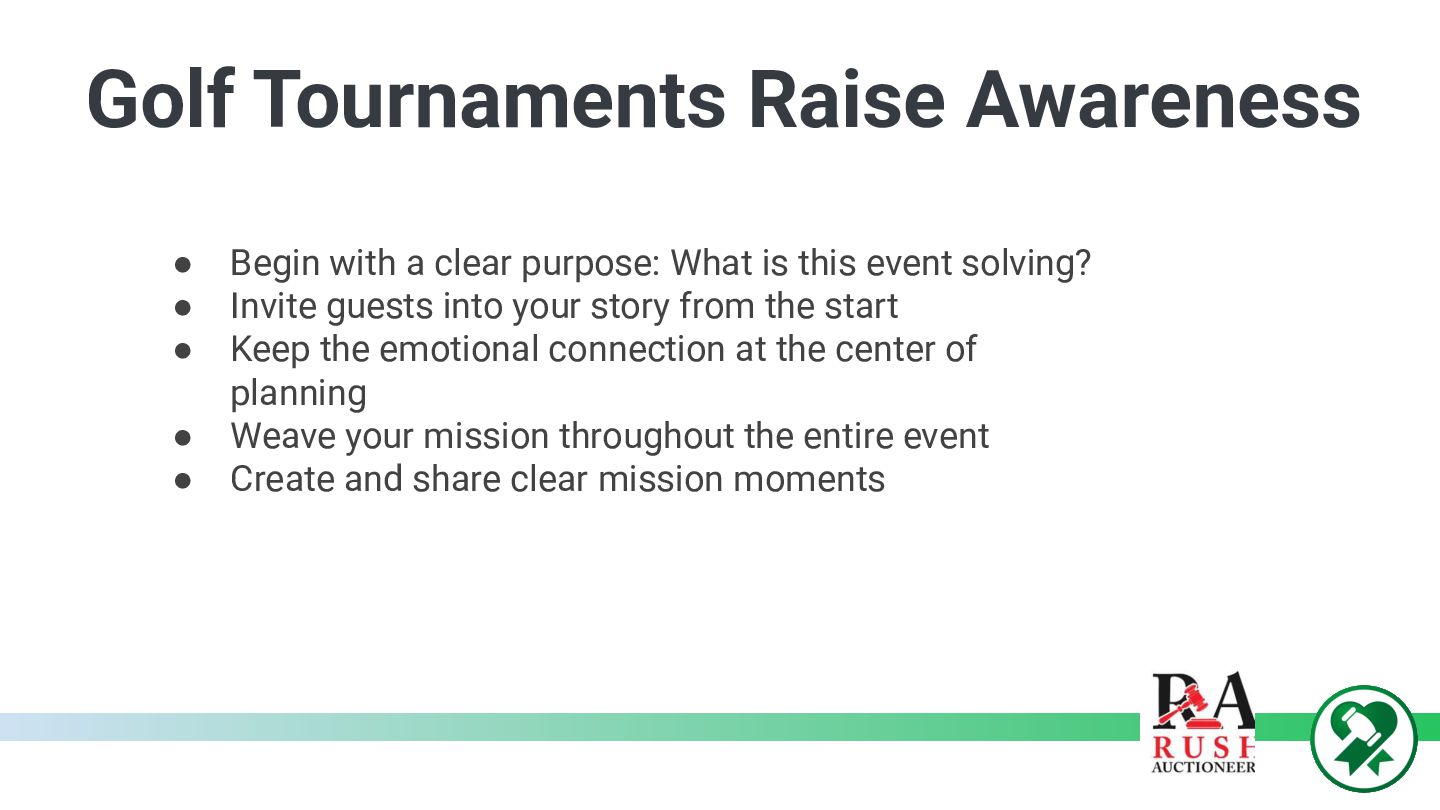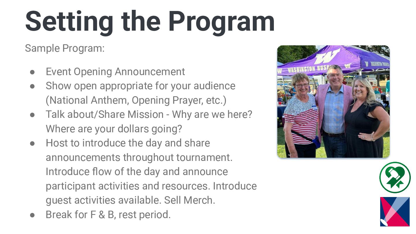 for your audience (National Anthem, Opening Prayer, etc.) • Talk about/Share Mission - Why are we here? Where are your dollars going? • Host to introduce the day and share announcements throughout tournament. Introduce flow of the day and announce participant activities and resources. Introduce guest activities available. Sell Merch. • Break for F & B, rest period. Setting the Program