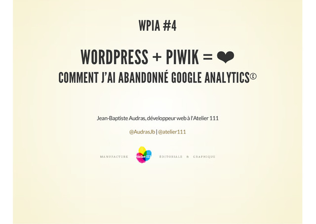 Talk de Jb Audras (Atelier-111) lors de la 4ème édition de WordPress in Alps, le 17 mars 2015. À propos de WordPress, de Piwik, des mesure d'audience open-source et de la réglementation CNIL sur les cookies.
