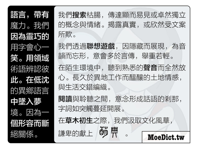 個形容而斷 絕關係。 我們搜索枯腸,傳達顯而易見或卓然獨立 的概念與情緒。揭露真實,或欣然受文案 所欺。 我們透過聯想遊戲,因隱藏而展現,為音 韻而忘形,意會多於言傳,舉重若輕。 在陌生環境中,聽到熟悉的聲音而全然放 心。長久於異地工作而醞釀的土地情感, 與生活交錯編織。 閱讀與聆聽之間,意念形成話語的剎那, 字詞如突觸蔓延開展。 在草木初生之際,我們汲取文化風華, 謙卑的獻上 萌典 。 MoeDict.tw