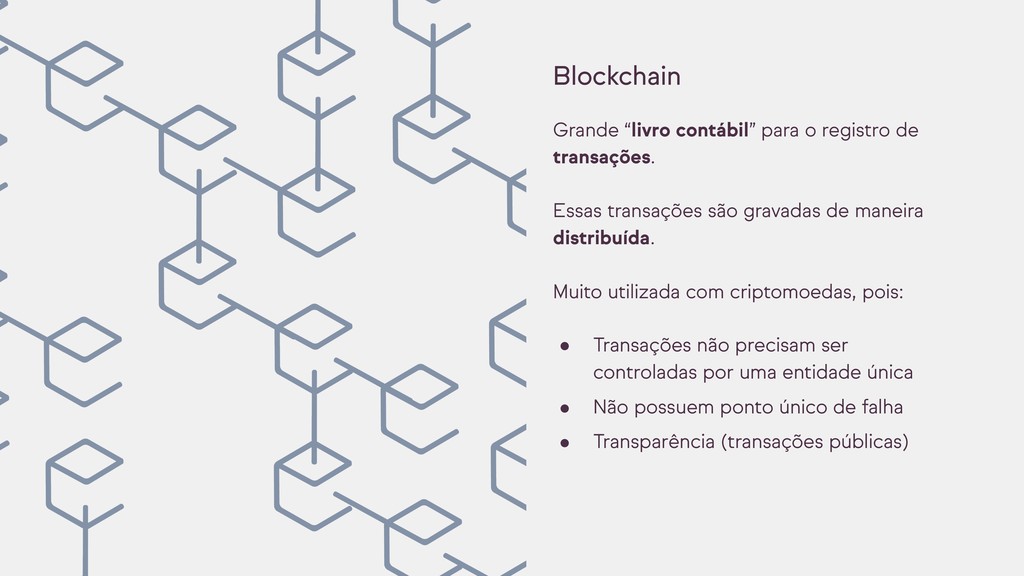 são gravadas de maneira distribuída. Muito utilizada com criptomoedas, pois: Blockchain ! Transações não precisam ser controladas por uma entidade única ! Não possuem ponto único de falha ! Transparência (transações públicas)