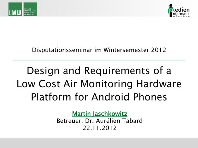 Monitoring Hardware Platform for Android Phones Design and Requirements of a Low Cost Air Monitoring Hardware Platform for Android Phones Disputationsseminar im Wintersemester 2012 Martin Jaschkowitz Betreuer: Dr. Aurélien Tabard 22.11.2012