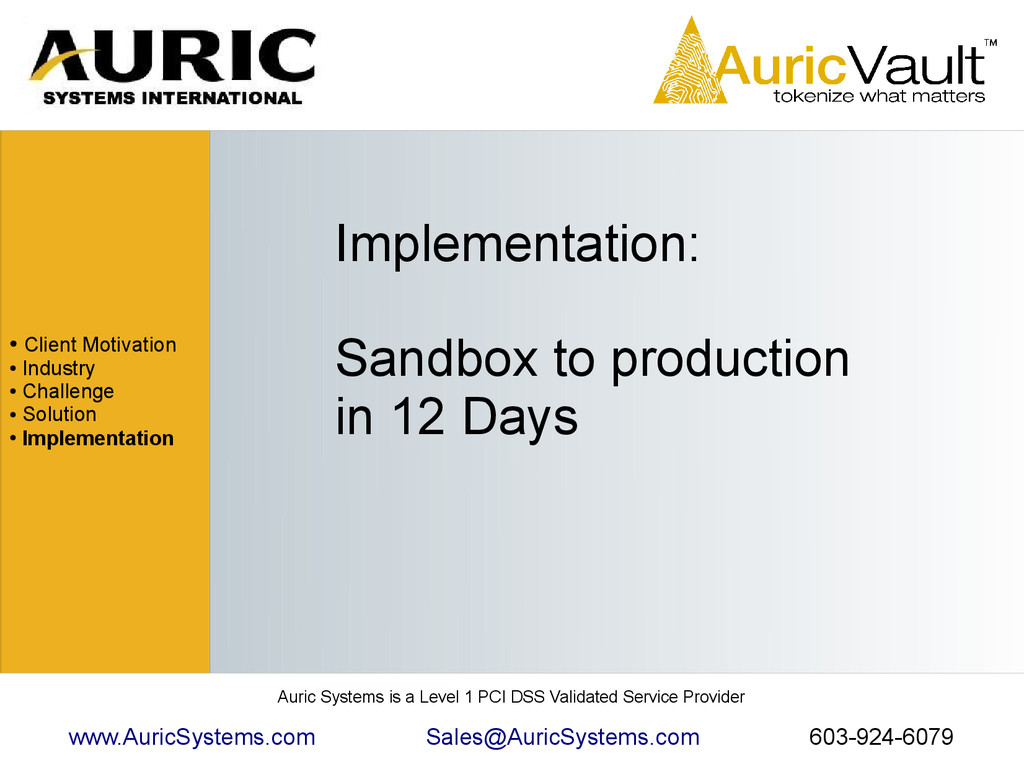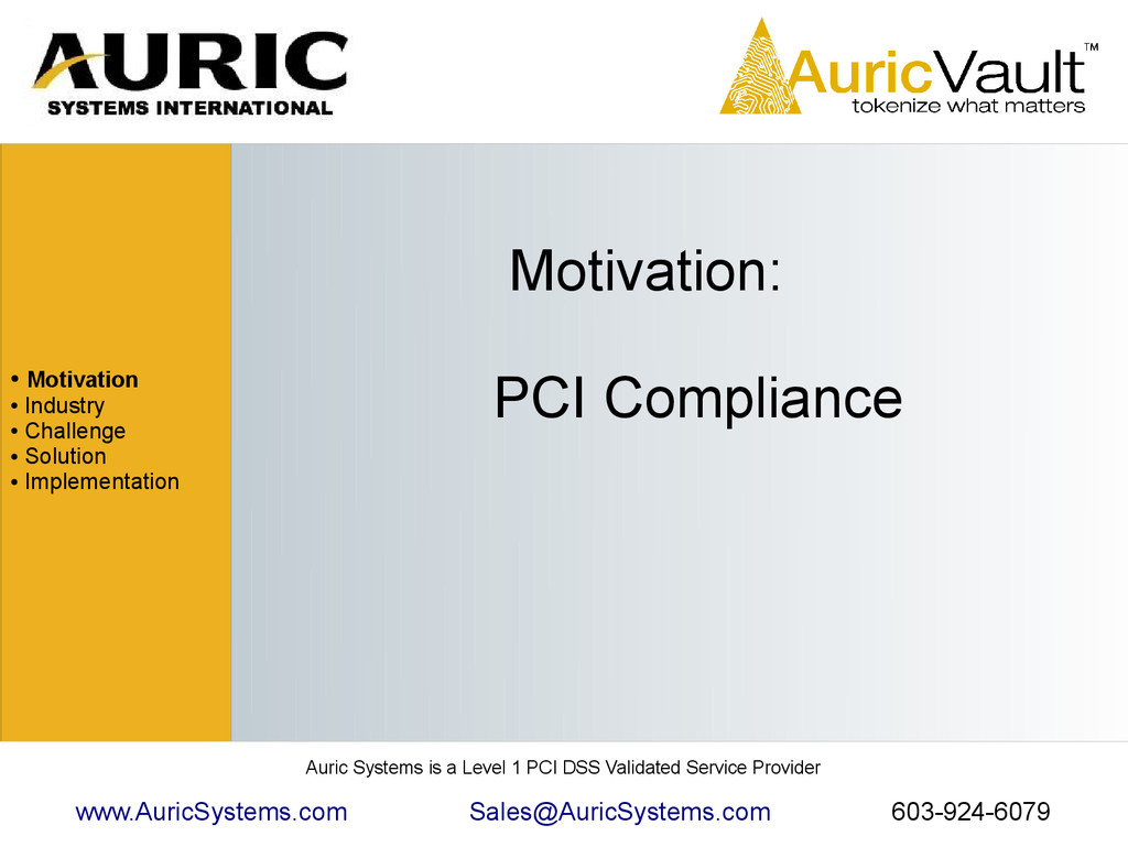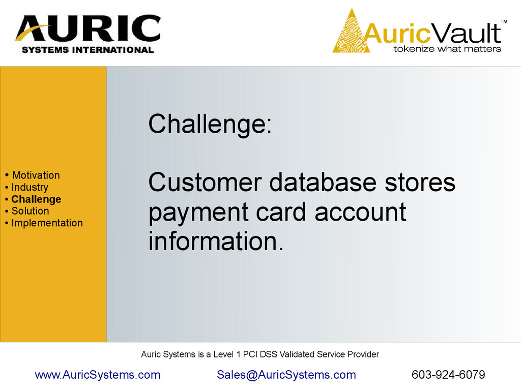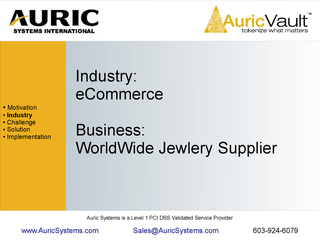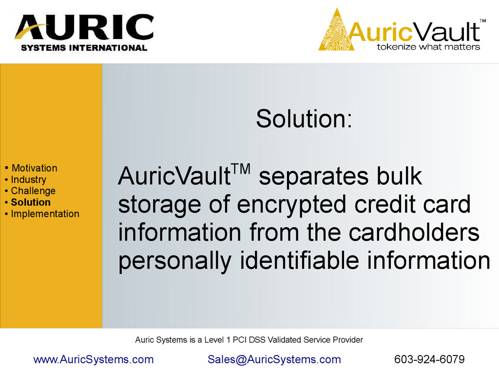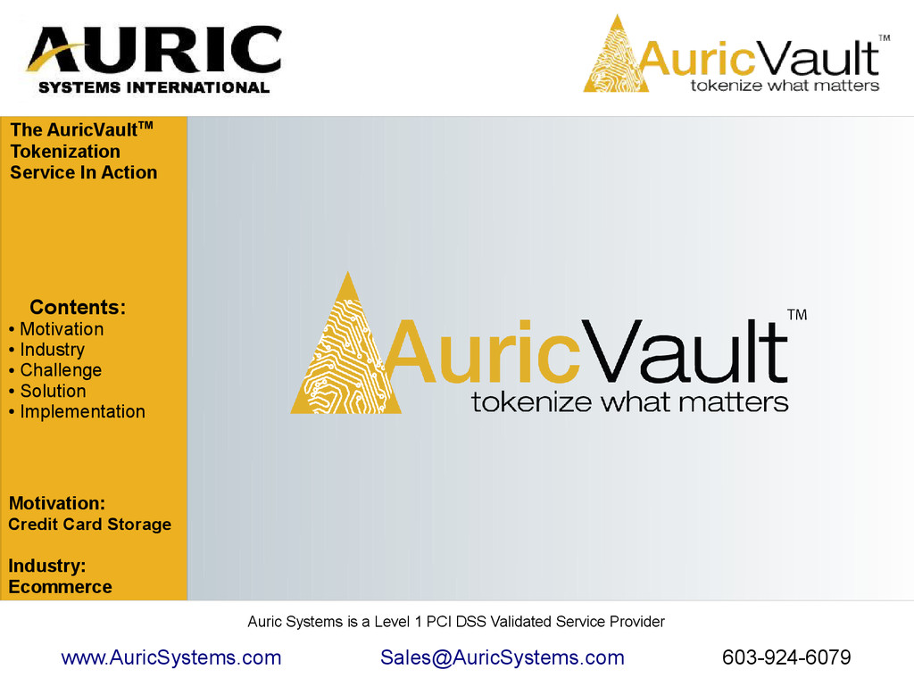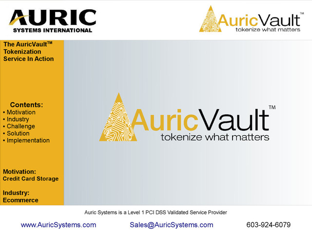 In this installment from the Auric Systems International presentation series "Tokenize What Matters" comes "AuricVault Tokenization Service in Action for Credit Card Storage for eCommerce" in a small 7 slide deck presentation we describe how the technology industry can store Credit Cards data off-site and gain PCI Compliance by using the AuricVault Tokenization Service.