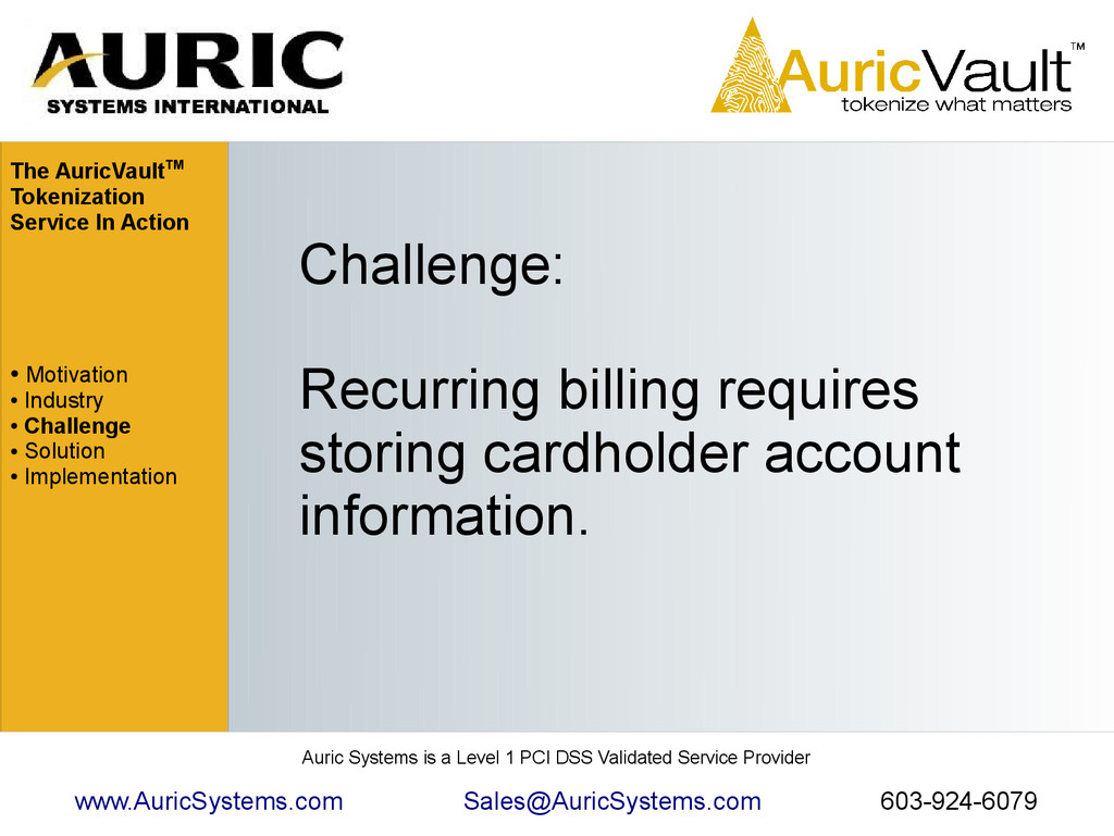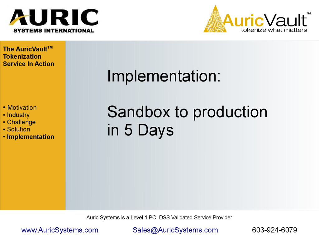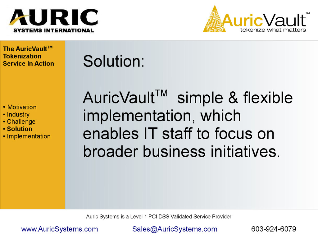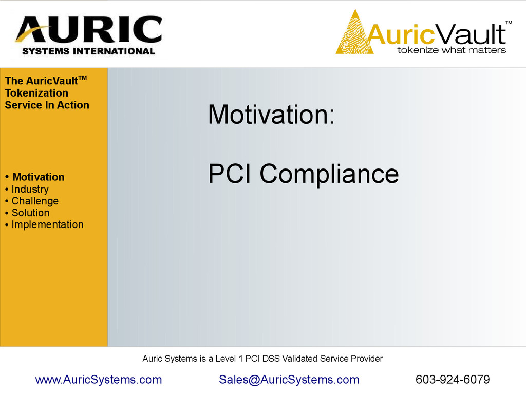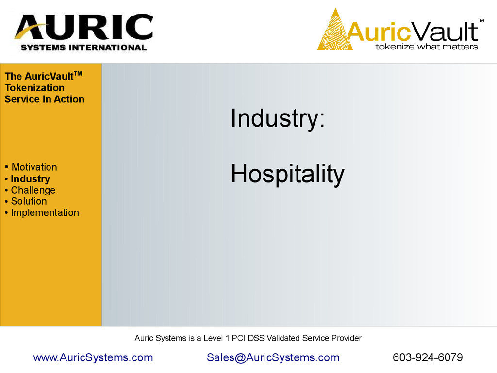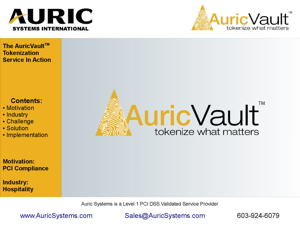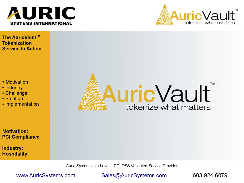 In this installment from the Auric Systems International presentation series "Tokenize What Matters" comes "AuricVault Tokenization Service in Action for PCI Compliance in the Hospitality Industry" in a small 7 slide deck presentation we describe how the hospitality industry can reap the rewards of PCI Compliance by using the AuricVault Tokenization Service