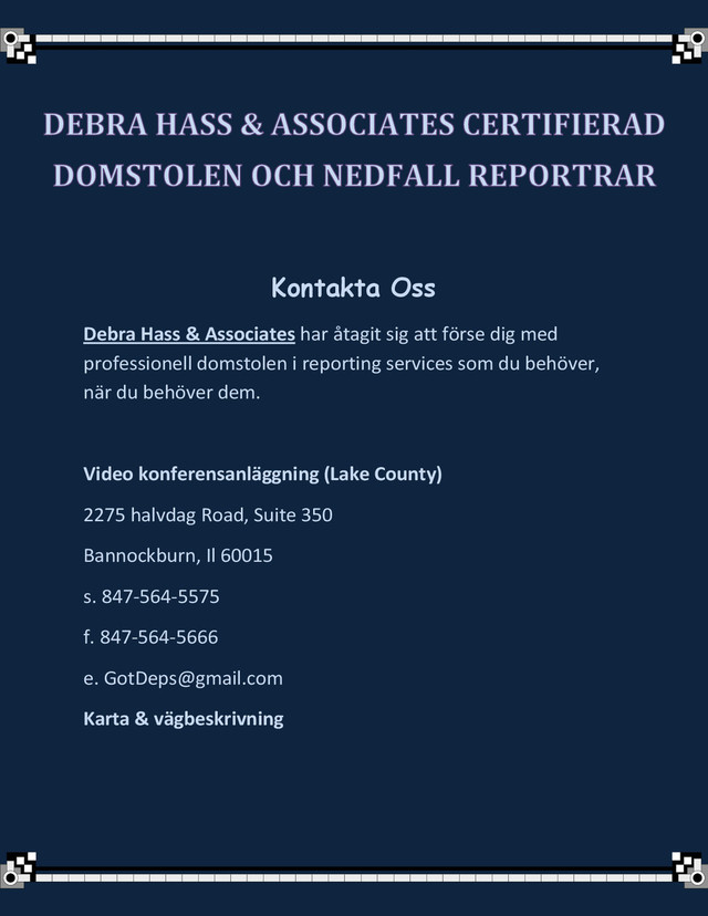 förse dig med professionell domstolen i reporting services som du behöver, när du behöver dem. Video konferensanläggning (Lake County) 2275 halvdag Road, Suite 350 Bannockburn, Il 60015 s. 847-564-5575 f. 847-564-5666 e. [email protected] Karta & vägbeskrivning