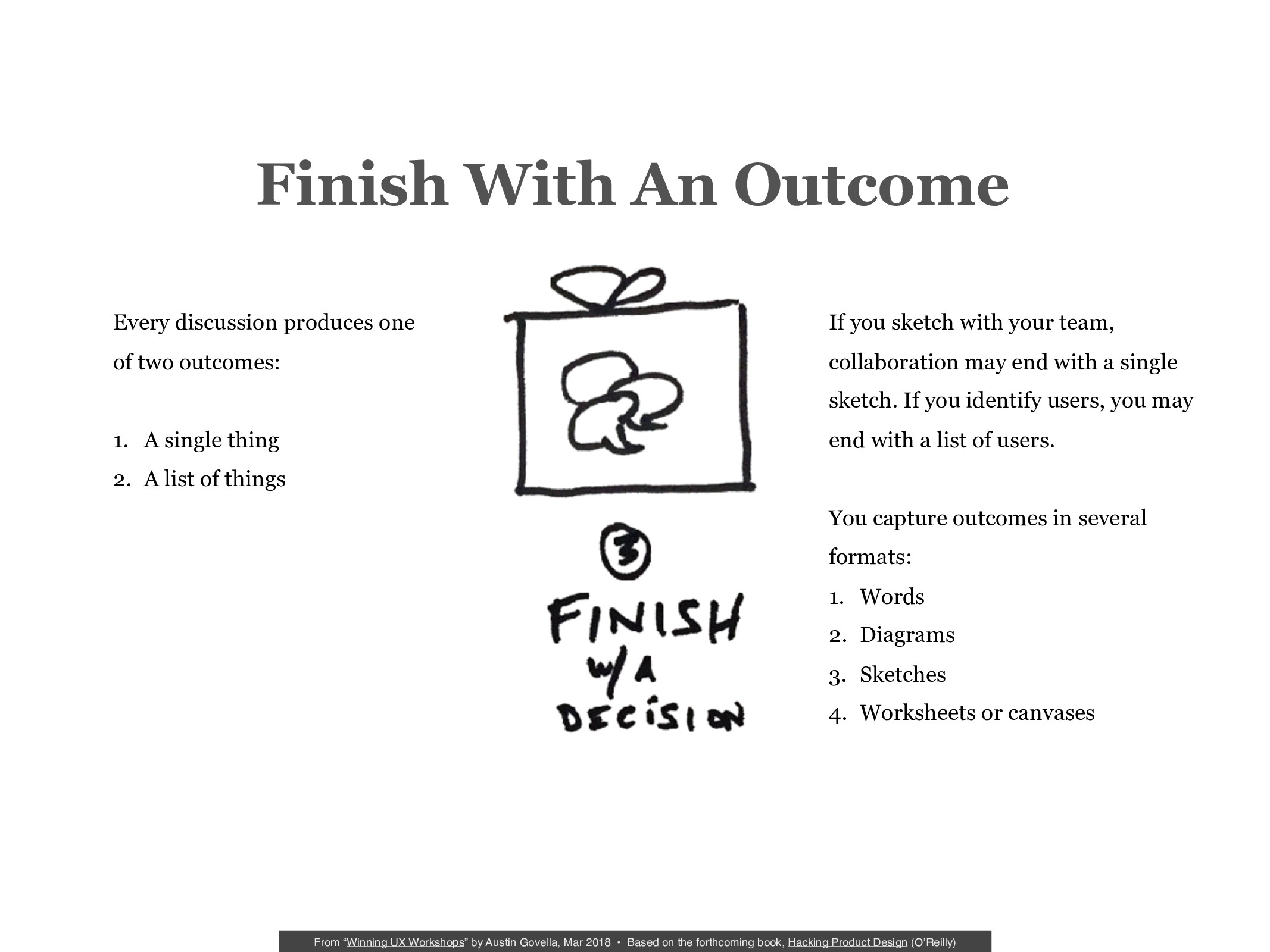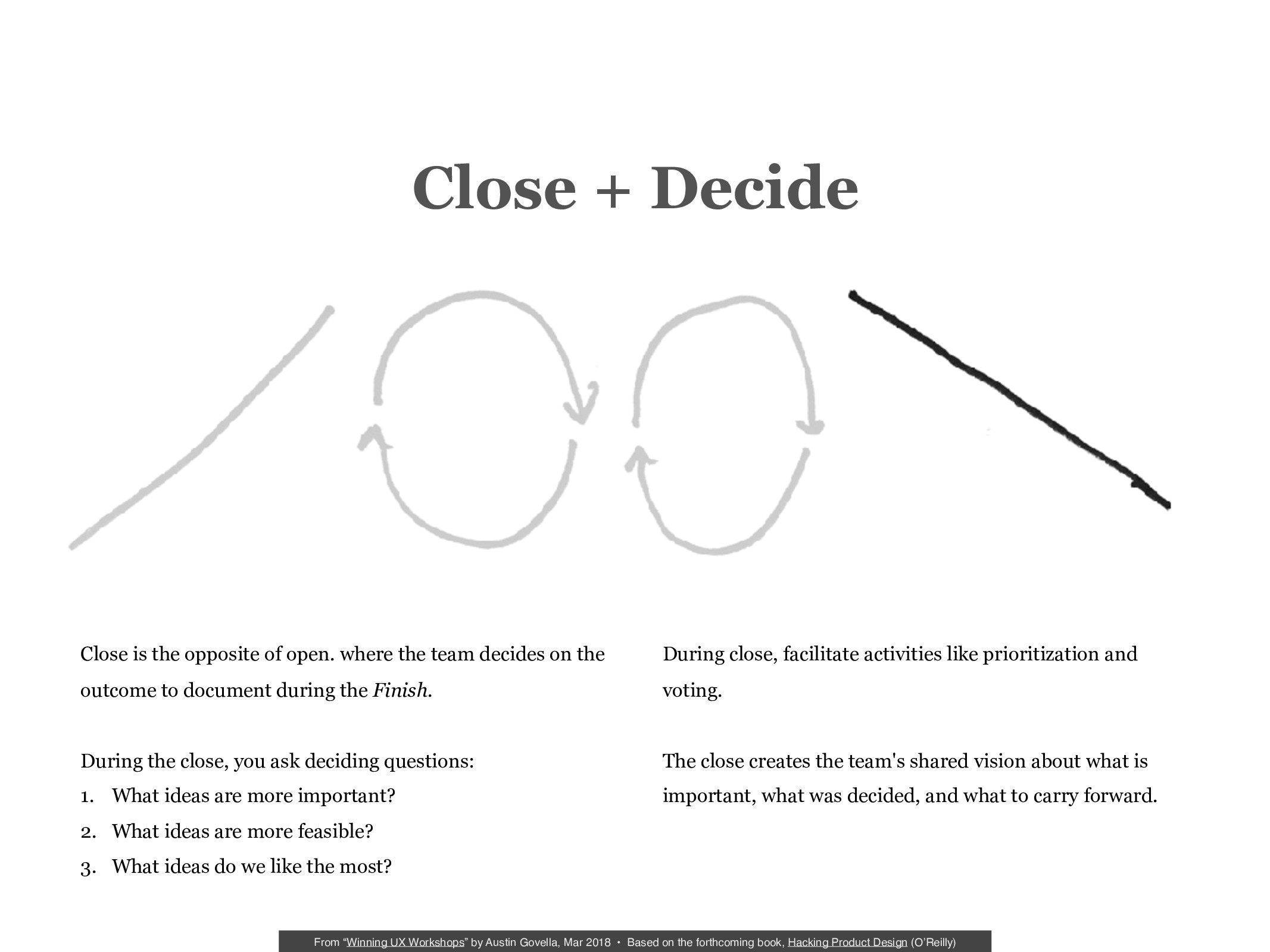 In this presentation, we’ll look at two strategies that maximize participation and guarantee clear outcomes and decisions. Attendees walk away with two checklists: one for guiding facilitation and another for structuring workshop activities.