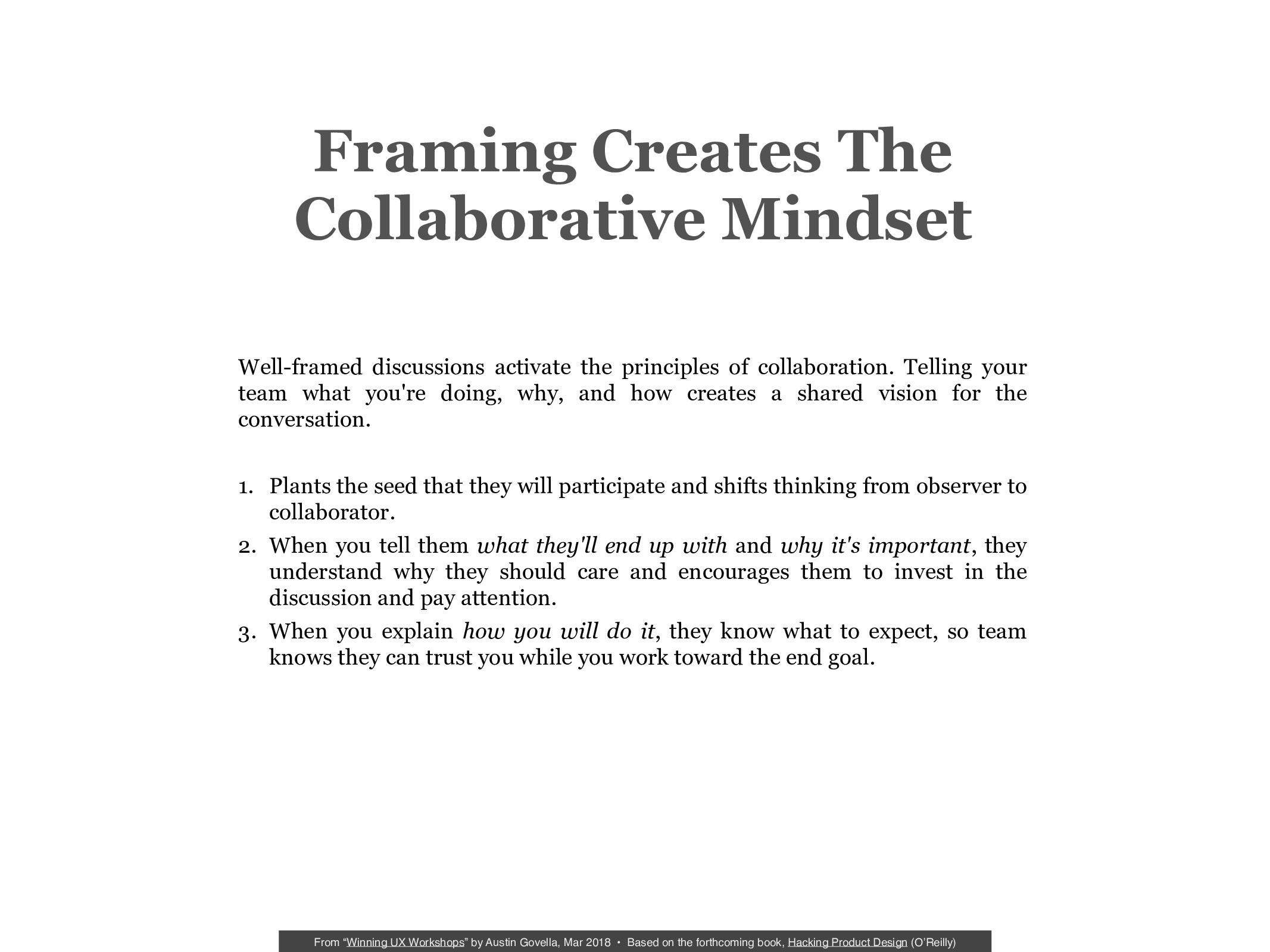 But facilitation skills are rarely the problem. Regardless of the type of workshop you want to run, good workshops depend almost entirely on how you structure the activities.