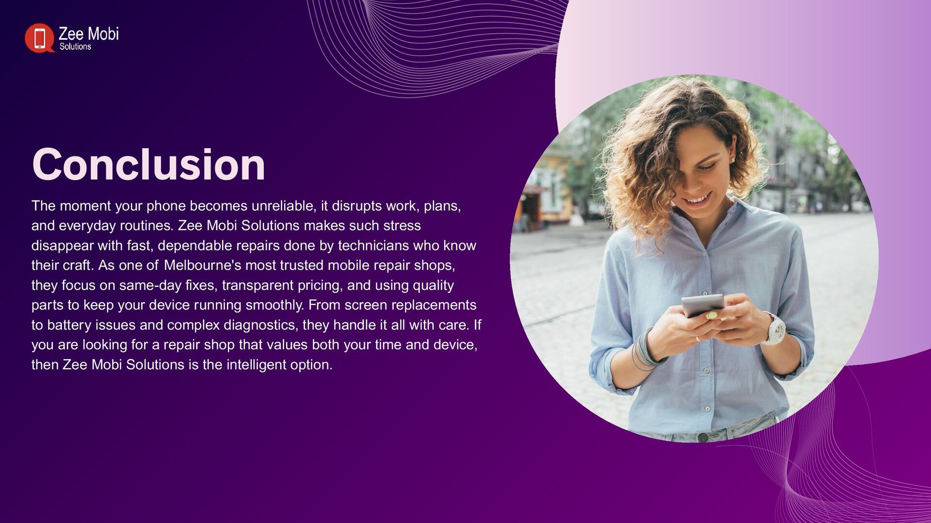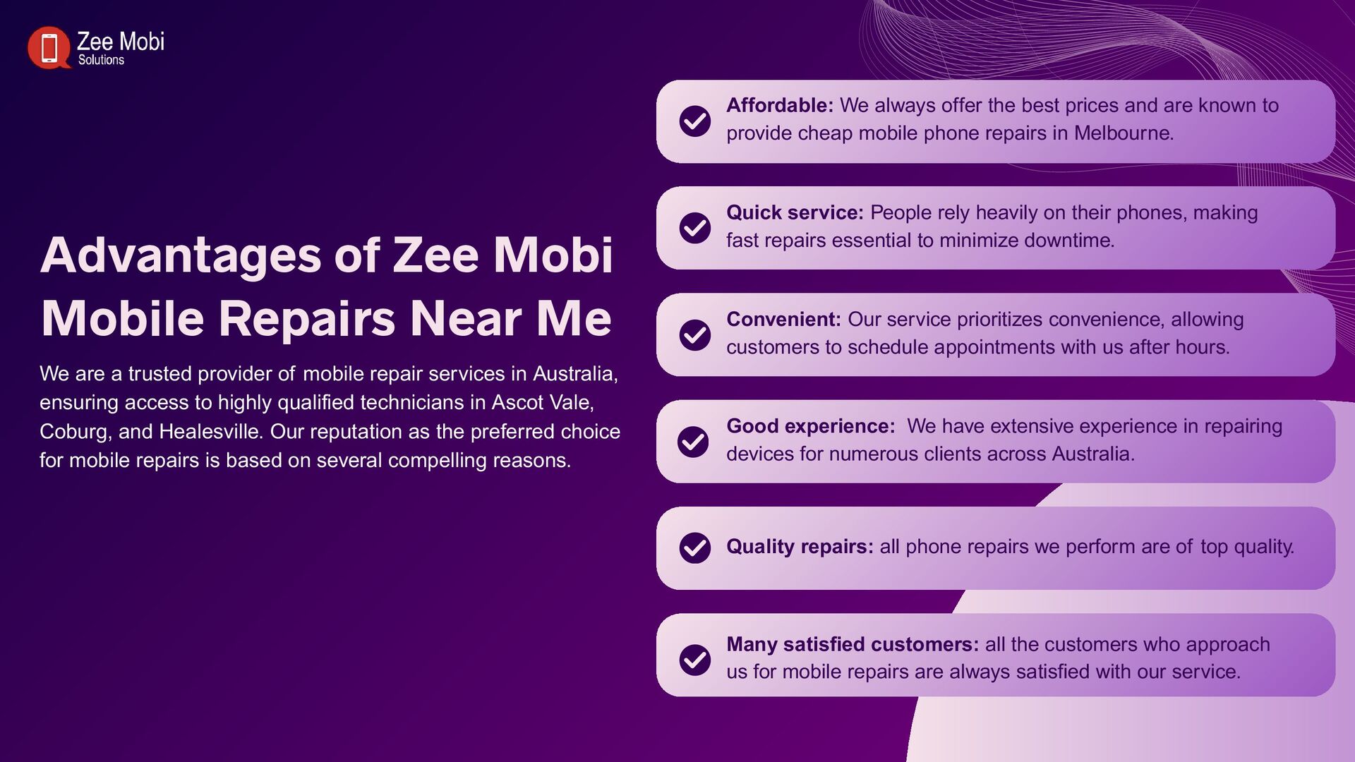 Zee Mobi Solutions is a famous mobile repair shop in Melbourne with experts in fast mobile phone repair. For all the major manufacturers of smartphones, the company offers quick, effective, and affordable mobile repair services, covering anything from software problems to damaged screens and batteries.