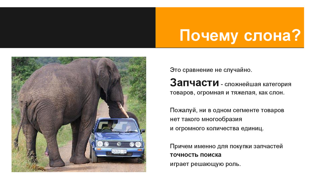 товаров, огромная и тяжелая, как слон. Пожалуй, ни в одном сегменте товаров нет такого многообразия и огромного количества единиц. Причем именно для покупки запчастей точность поиска играет решающую роль.