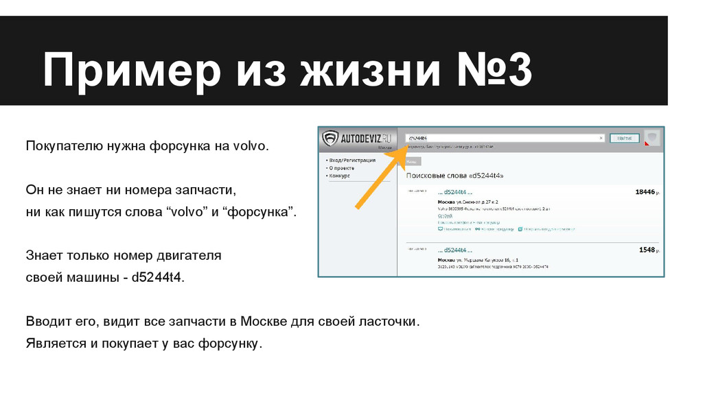 не знает ни номера запчасти, ни как пишутся слова “volvo” и “форсунка”. Знает только номер двигателя своей машины - d5244t4. Вводит его, видит все запчасти в Москве для своей ласточки. Является и покупает у вас форсунку.