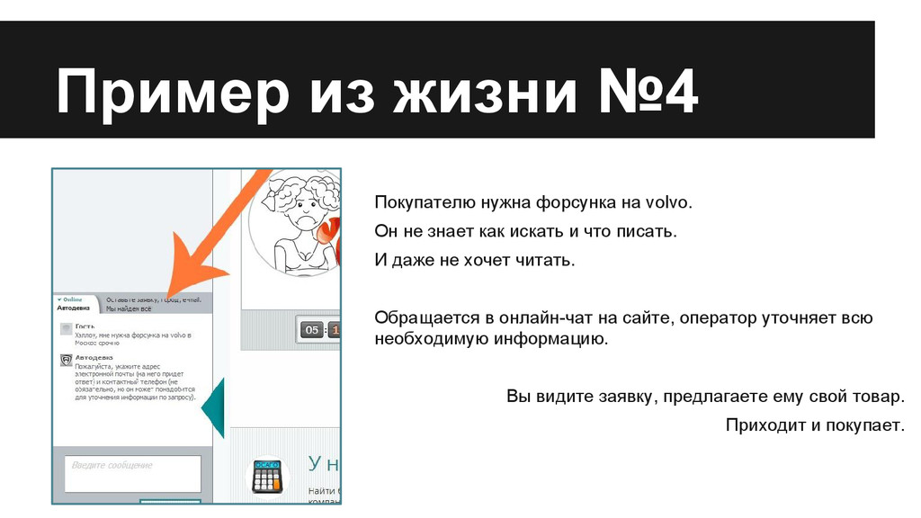 и что писать. И даже не хочет читать. Обращается в онлайн-чат на сайте, оператор уточняет всю необходимую информацию. Вы видите заявку, предлагаете ему свой товар. Приходит и покупает. Пример из жизни №4