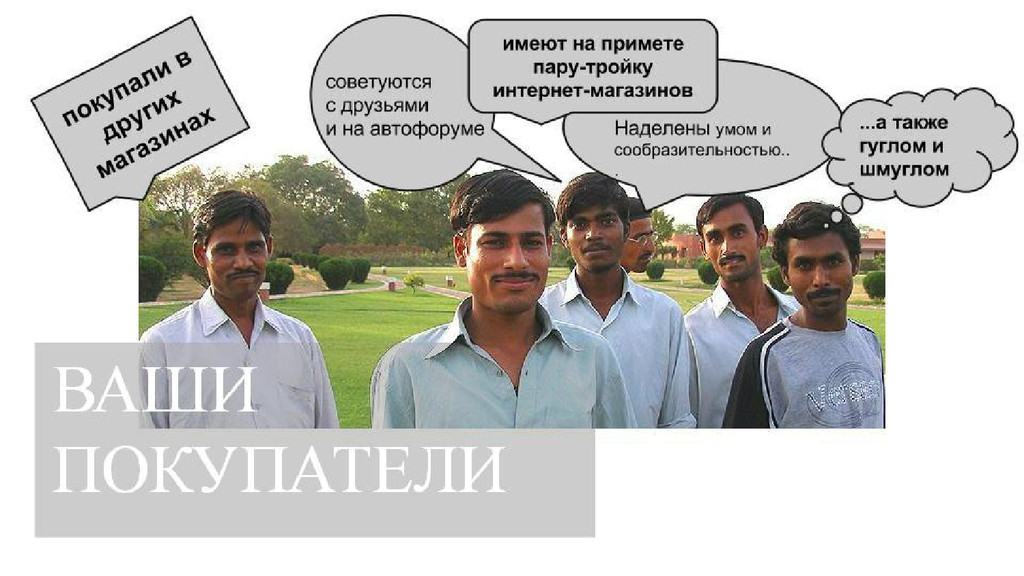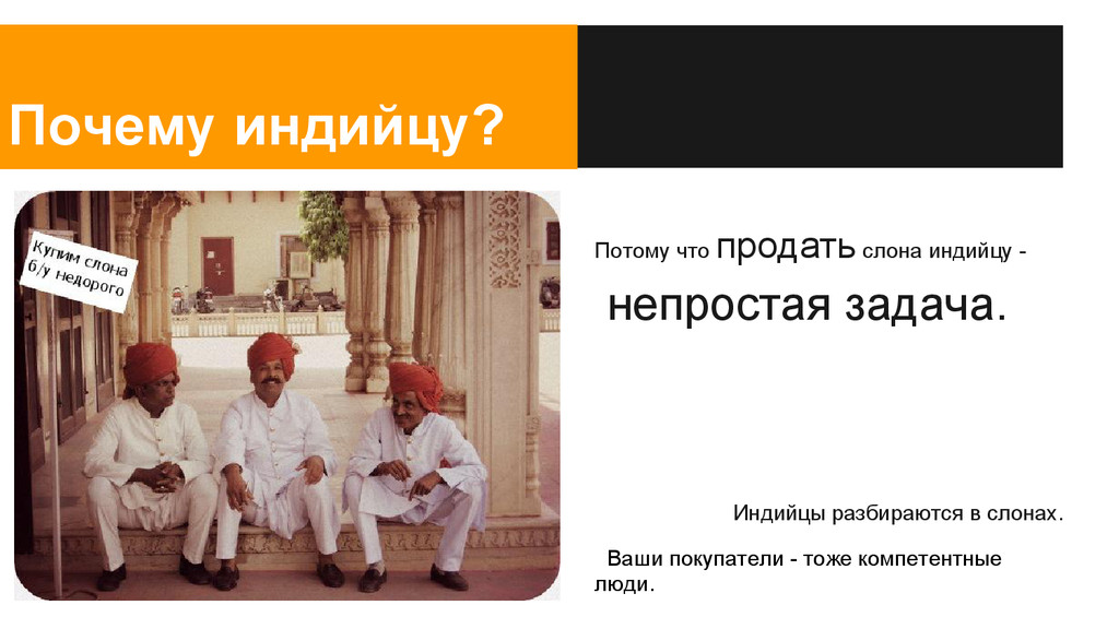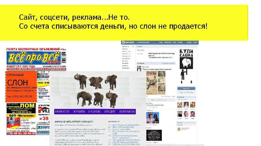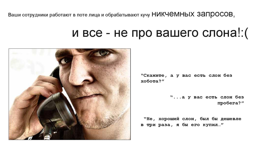 запросов, и все - не про вашего слона!:( “Скажите, а у вас есть слон без хобота?” “...а у вас есть слон без пробега?” “Не, хороший слон, был бы дешевле в три раза, я бы его купил…”