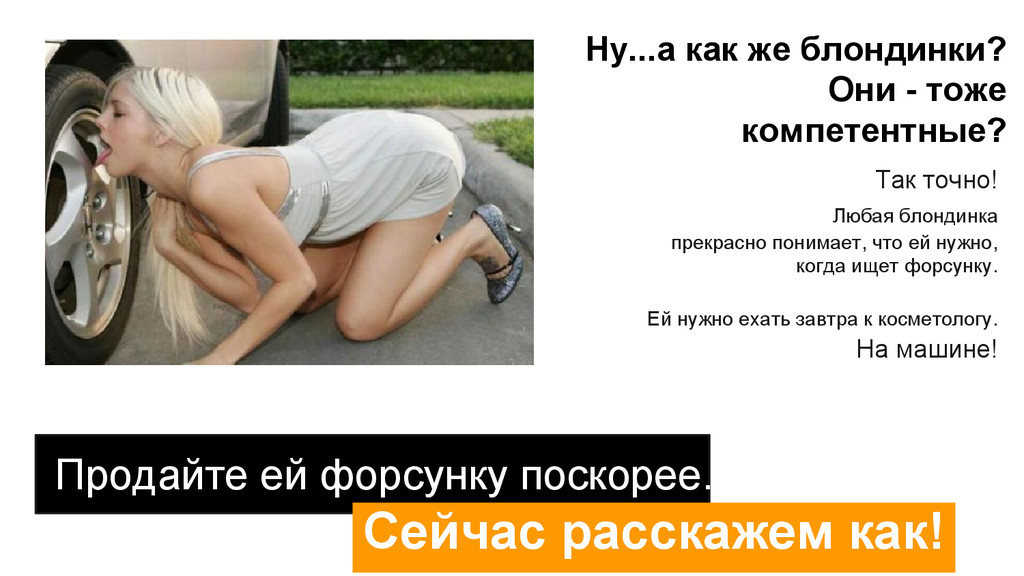 тоже компетентные? Так точно! Любая блондинка прекрасно понимает, что ей нужно, когда ищет форсунку. Ей нужно ехать завтра к косметологу. На машине! Продайте ей форсунку поскорее. Сейчас расскажем как!